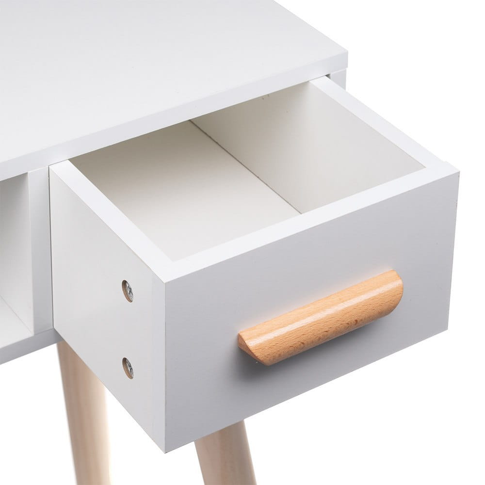 Ta wspaniała toaletka sprawi, że serca kobiet zabiją szybciej. Prosty, skandynawski kształt, dwie pojemne szufladki, wygodne lustro oraz półeczka pod blatem dopełniają całości. Od teraz masz wszystko pod ręką