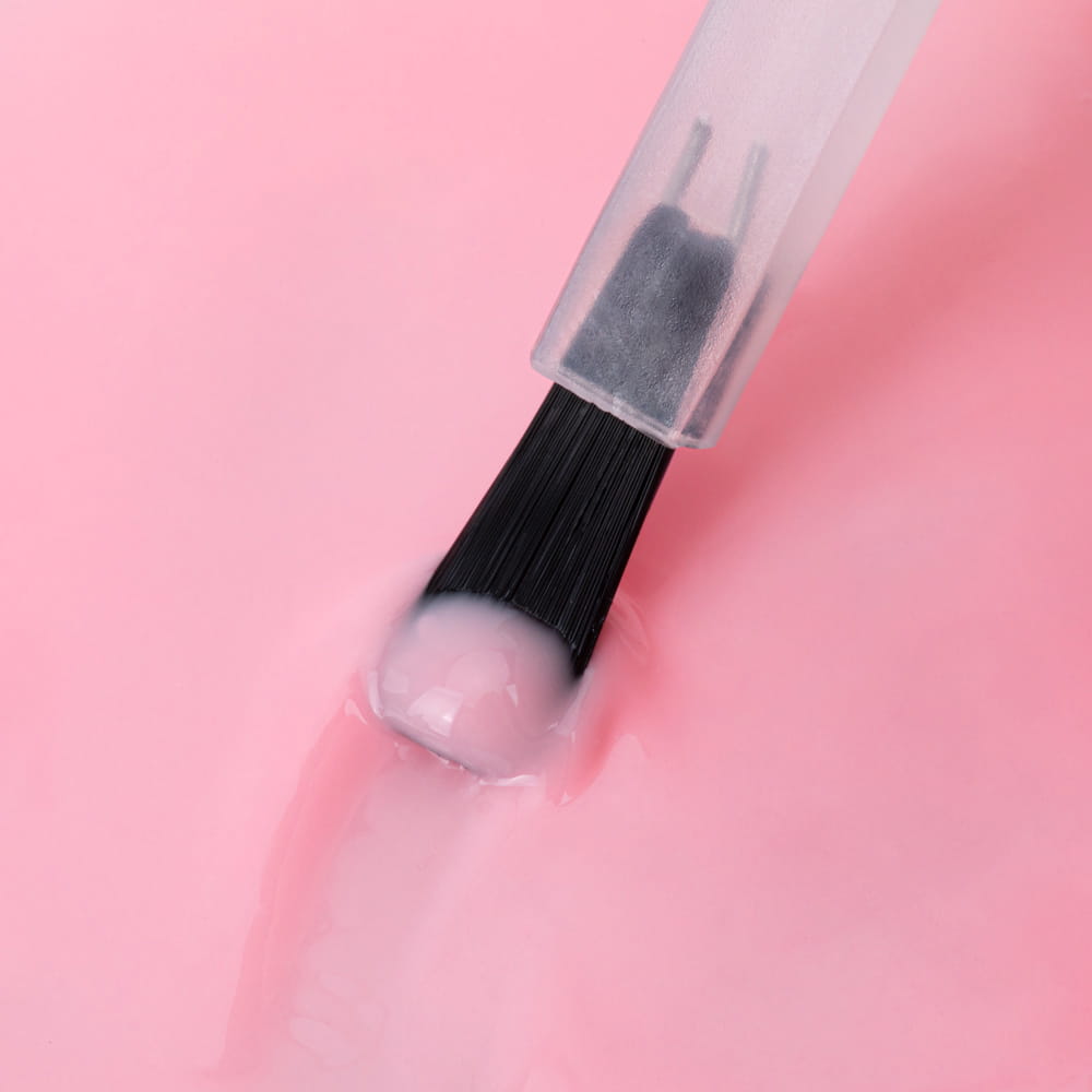 - Na przygotowaną płytkę paznokcia zaaplikuj warstwę bazy i utwardź ją w lampie 30-60 sekund. W razie potrzeby powtórz tę czynność, aby nadbudować apeks.