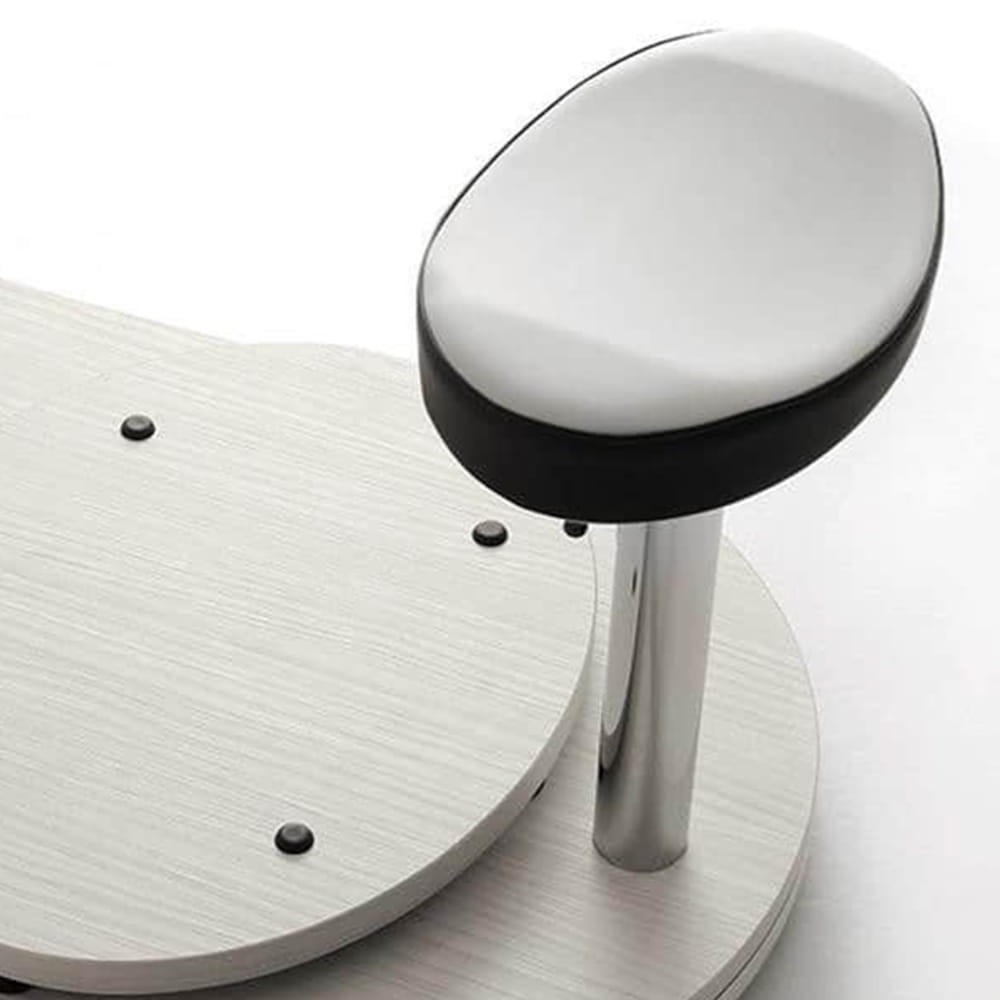 Podstawa zapewnia stabilność całego fotela i dodającej szyku i elegancji. Na podstawie zamontowano również podnóżek ułatwiający pielęgnację stóp z możliwością regulacji wysokości. Zaprojektowano i stworzono także specjalną, ruchomą misę do kąpieli stóp. Możliwość łatwego przenoszenia naczynia zapewnia wygodę w napełnianiu i wymianie wody. System MINI ISLAND EVO został skonstruowany z myślą o gabinetach podologicznych, a także gabinetach kosmetycznych zajmujących się podologią. Niewielkie rozmiary MINI ISLAND EVO znajda również zastosowanie w salonach dysponujących niewielką powierzchnią gabinetową.