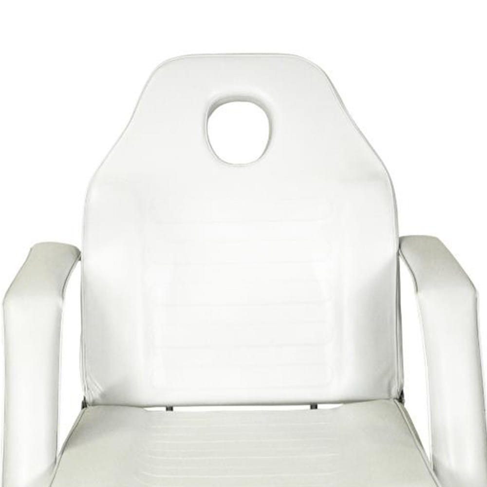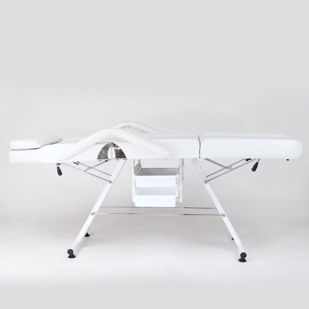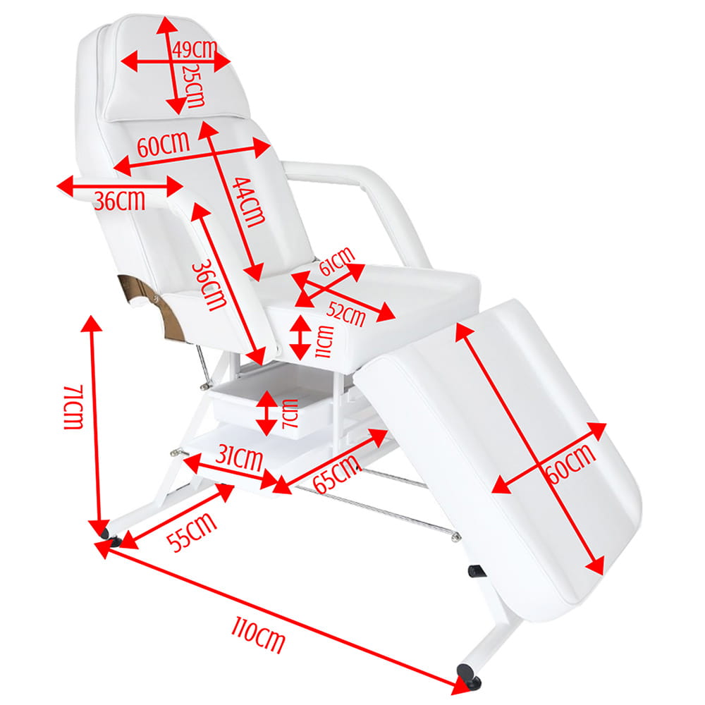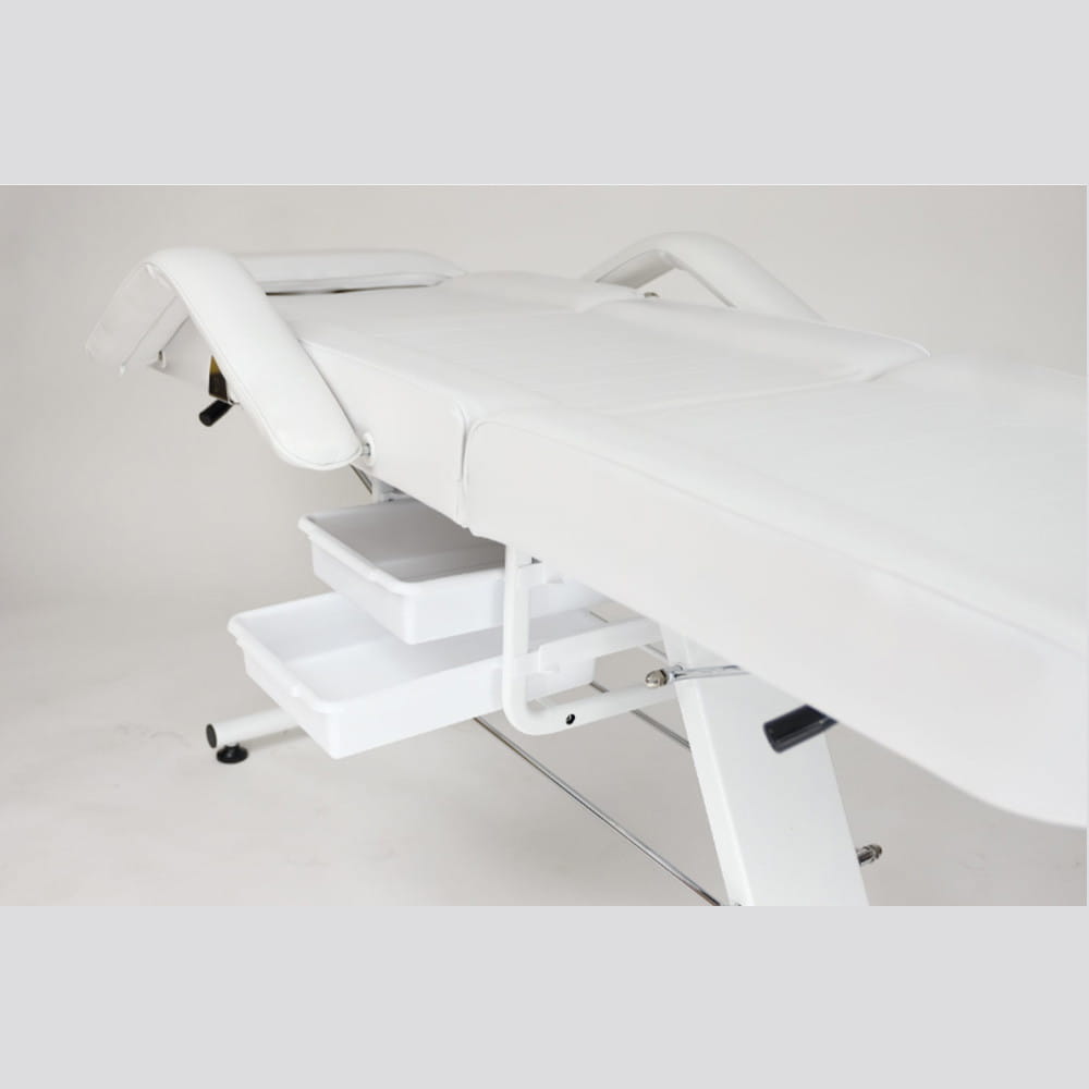 Fotel kosmetyczny usytuowany na stabilnej podstawie, która posiada zamontowane dwie wysuwane kuwety. Fotel posiada zdejmowany podgłówek, który zaślepia otwór w zagłówku. Podłokietniki można zdemontować wedle potrzeb. Fotel wykonany jest z wysokogatunkowej eko-skóry, która jest łatwa w utrzymaniu czystości oraz odporna na wybrane środki do dezynfekcji. Siedzisko osadzone jest na stabilnej podstawie, która jest polakierowana. Oparcie oraz podnóżek posiada manualny, bardzo wygodny, system regulacji konta pochylenia. Dzięki regulacji pochylenia oparcia i podnóżka, można fotel ustawić w optymalny sposób dla prawidłowego i wygodnego wykonania zabiegu. Fotel jest doskonałym wyborem biorąc pod uwagę cenę, jakość wykonania oraz funkcjonalność.