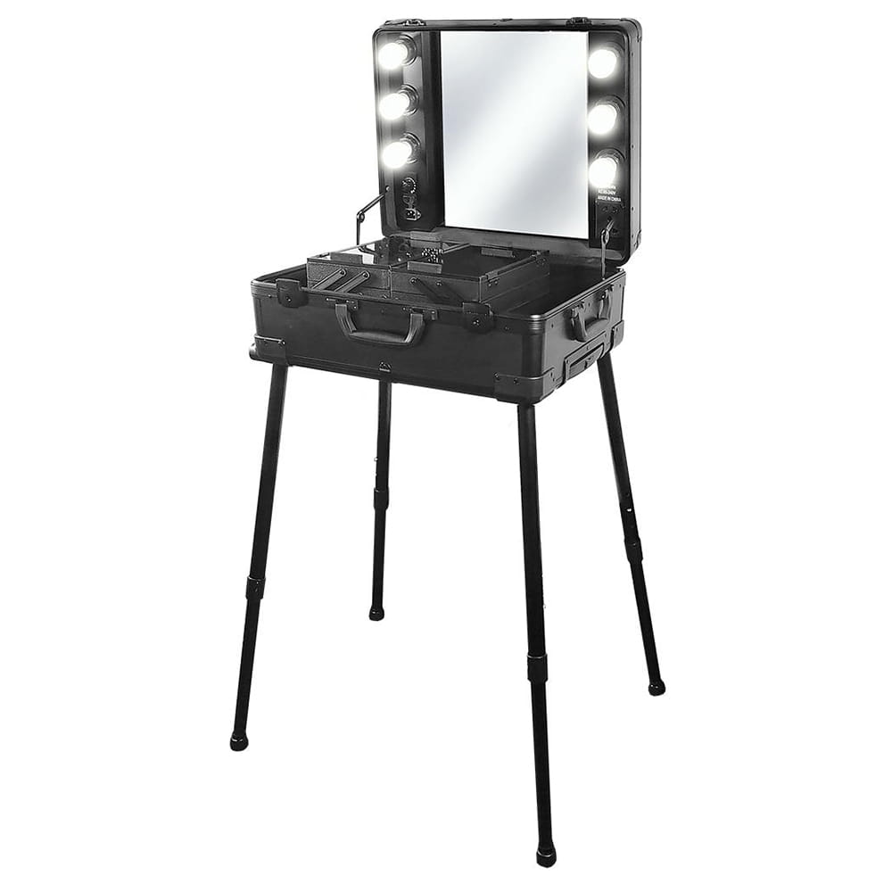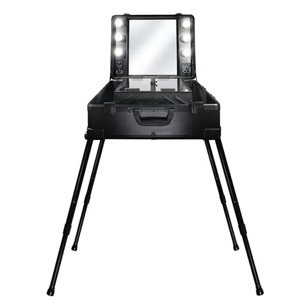 Stanowisko do makijażu przeznaczone dla profesjonalnych wizażystów, jak również do użytku domowego. Zestaw posiada wbudowane lustro oświetlone aż 6 lampami LED oraz rozkładane półki służące również jako podstawa.