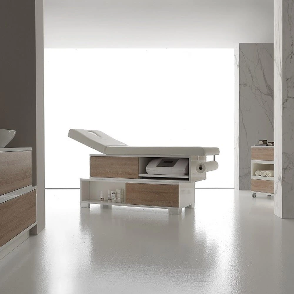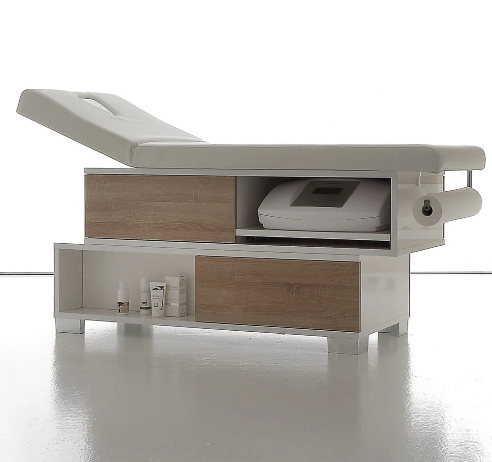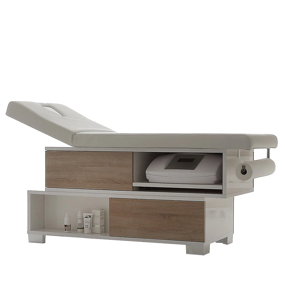 Leżanka do masażu SWING wykonana jest z błyszczącego, białego laminatu z frontami dostępnymi w trzech różnych wykończeniach: dąb bardolino, biały modrzew, naturalny wenge. Łóżko wyposażone jest w dwie szafki, wysuwaną półkę na urządzenie kosmetyczne oraz dwie otwarte półki na kosmetyki, ręczniki i.in. potrzebne akcesoria. Leżanka posiada bardzo wygodny miękki materac pokryty skórką w kolorze białym posiadający otwór w zagłówku z zaślepką. Regulowane oparcie daje możliwość wykonywania szerokiej gamy zabiegów kosmetycznych. Dodatkowo wyposażona jest w uchwyt na rolkę.