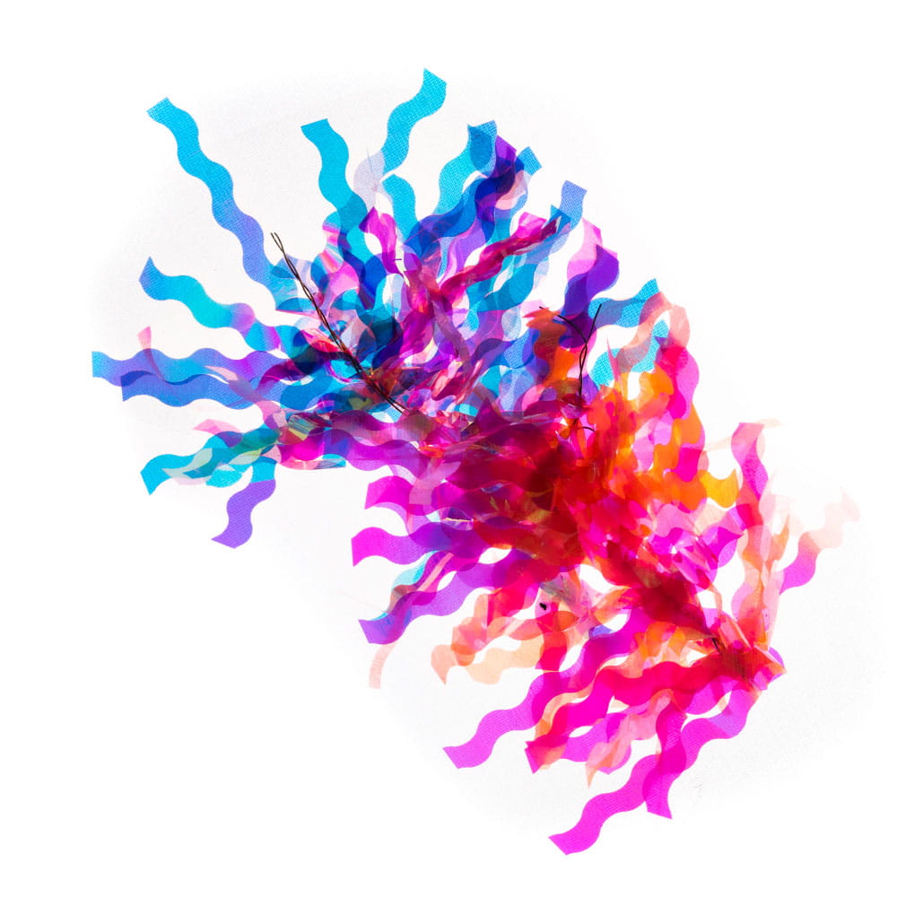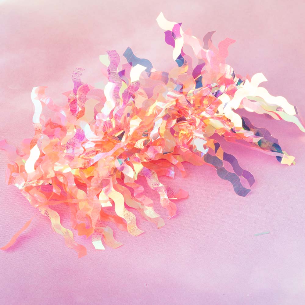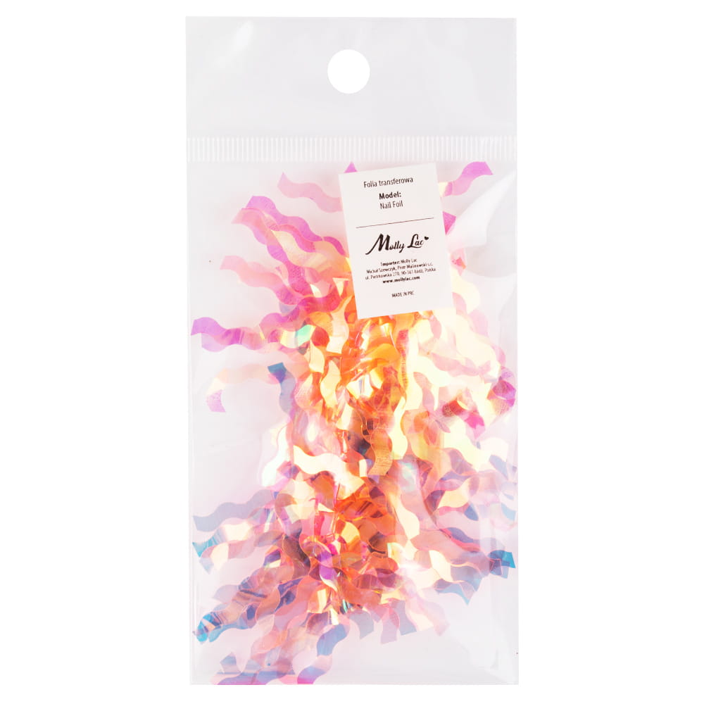 Folia celofanowa do paznokci w kształcie fal, opalizująca holograficznie w odcienie fuksji, pastelowej pomarańczy i zieleni.