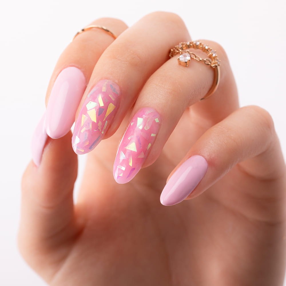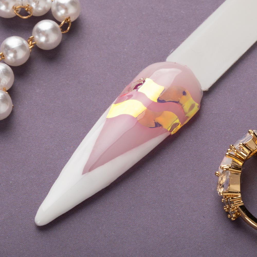 Folia na paznokciach tworzy wrażenie tafli szkła, a dzięki holograficznym przejściom tonalnym daje złudzenie efektu 3D. Elementy przymocowane są do zbiorczego paska, z którego odcina się potrzebną ilość ozdób. Dzięki temu nie zagubią się i nie pogniotą.
