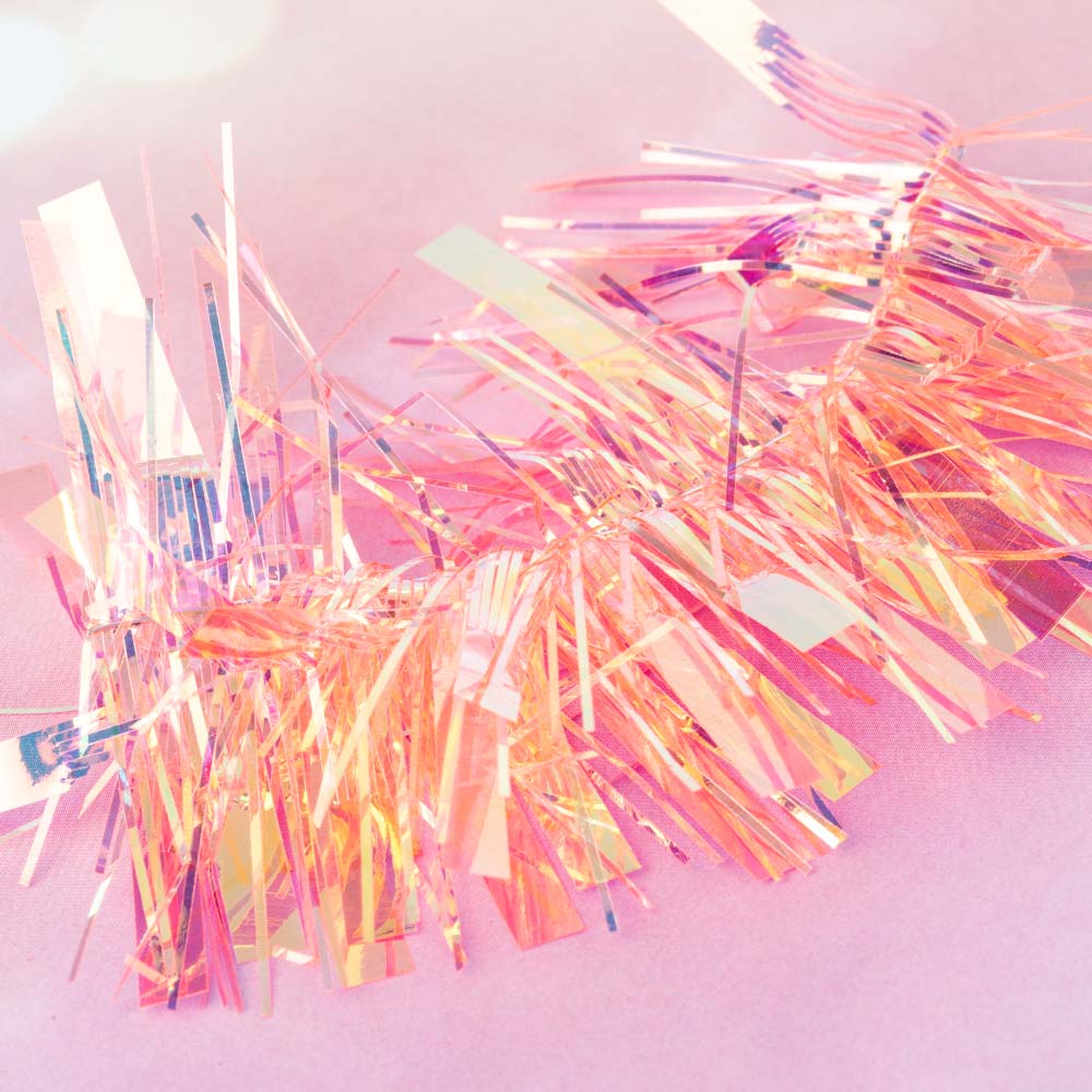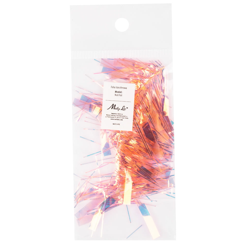 Folia celofanowa do paznokci w dwóch kształtach – pasków i prostokątów, opalizująca holograficznie w odcienie różu, złota i pomarańczu.