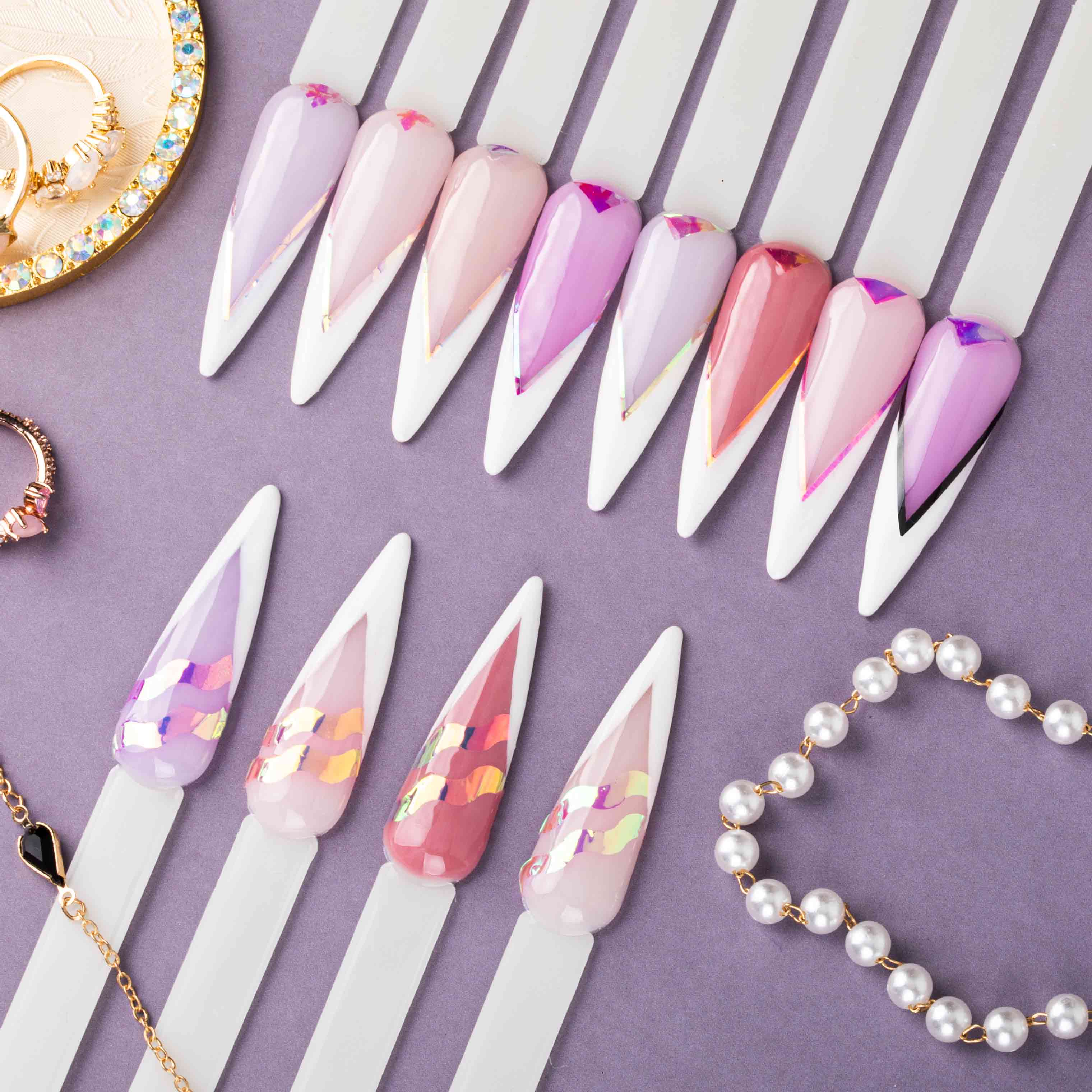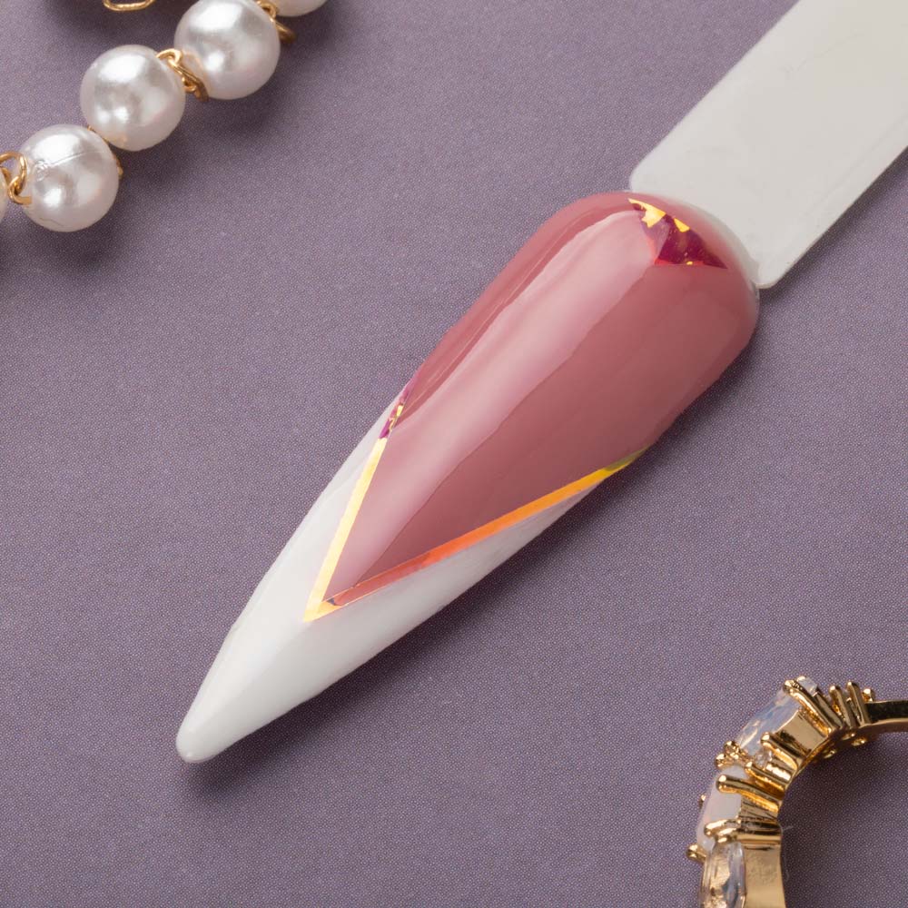 Folia na paznokciach tworzy wrażenie tafli szkła, a dzięki holograficznym przejściom tonalnym daje złudzenie efektu 3D. Elementy przymocowane są do zbiorczego paska, z którego odcina się potrzebną ilość ozdób. Dzięki temu nie zagubią się i nie pogniotą.