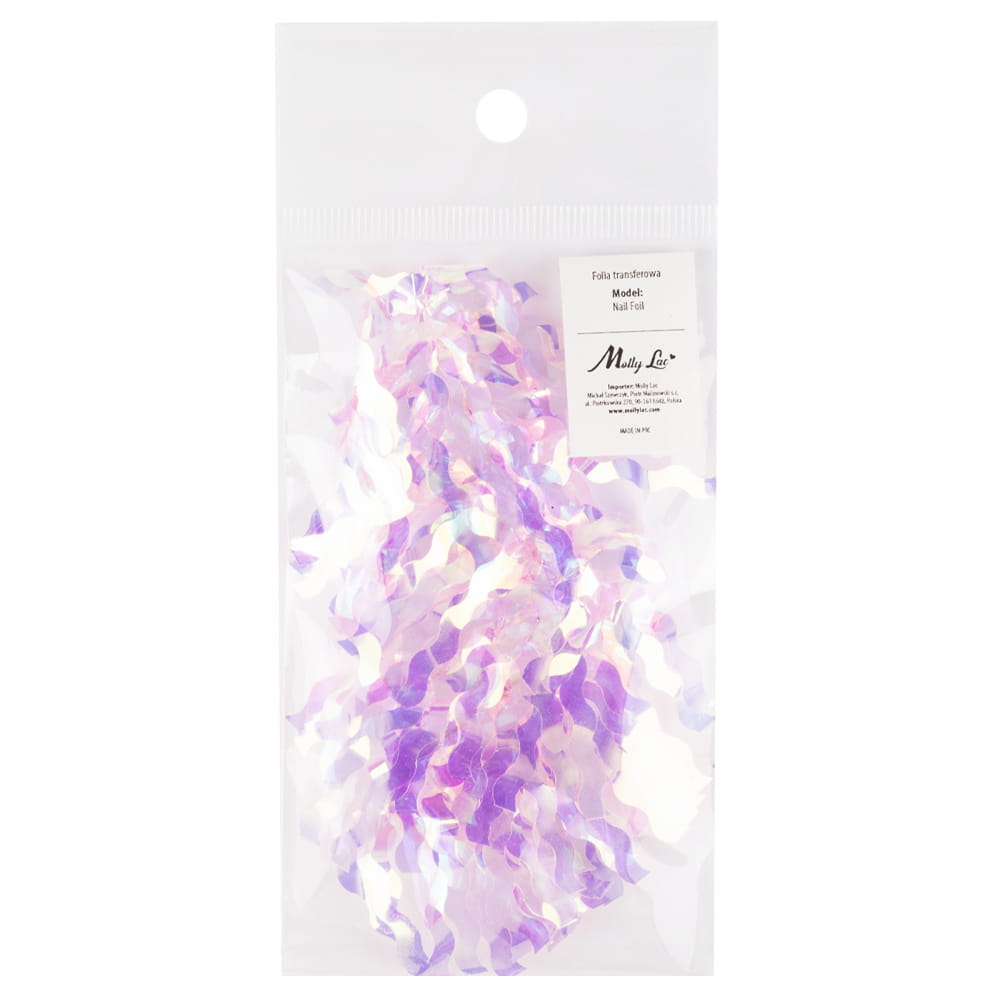 Folia celofanowa do paznokci w dwóch kształtach – pasków i prostokątów, opalizująca holograficznie w odcienie błękitu, różu i złota. To idealne i szybkie rozwiązanie w oryginalnym zdobieniu paznokci hybrydowych, akrylowych, żelowych oraz naturalnej płytki lub lakieru klasycznego.
