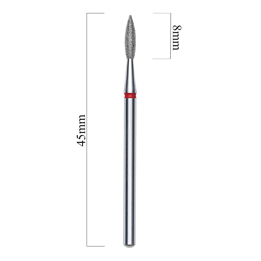 Czerwony frez o miękkiej ziarnistości do najbardziej delikatnego opracowania skóry, odpowiedni dla początkujących i profesjonalnych stylistów. Kształt "Ostry płomień" do obróbki skórek, wałków bocznych, zgrubień bez ryzyka uszkodzenia skóry.