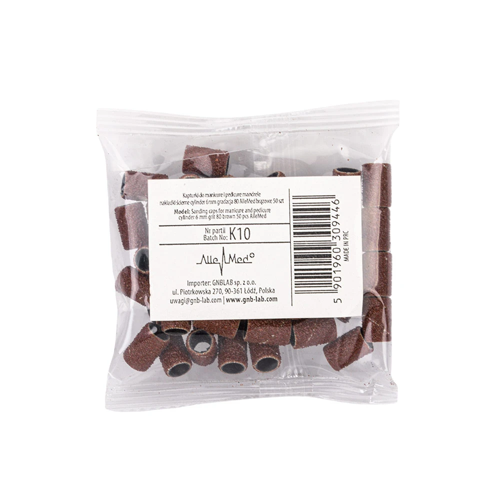 Kapturki do manicure i pedicure mandrele nakładki ścierne cylinder 6mm gradacja 80 AlleMed brązowe 50 szt