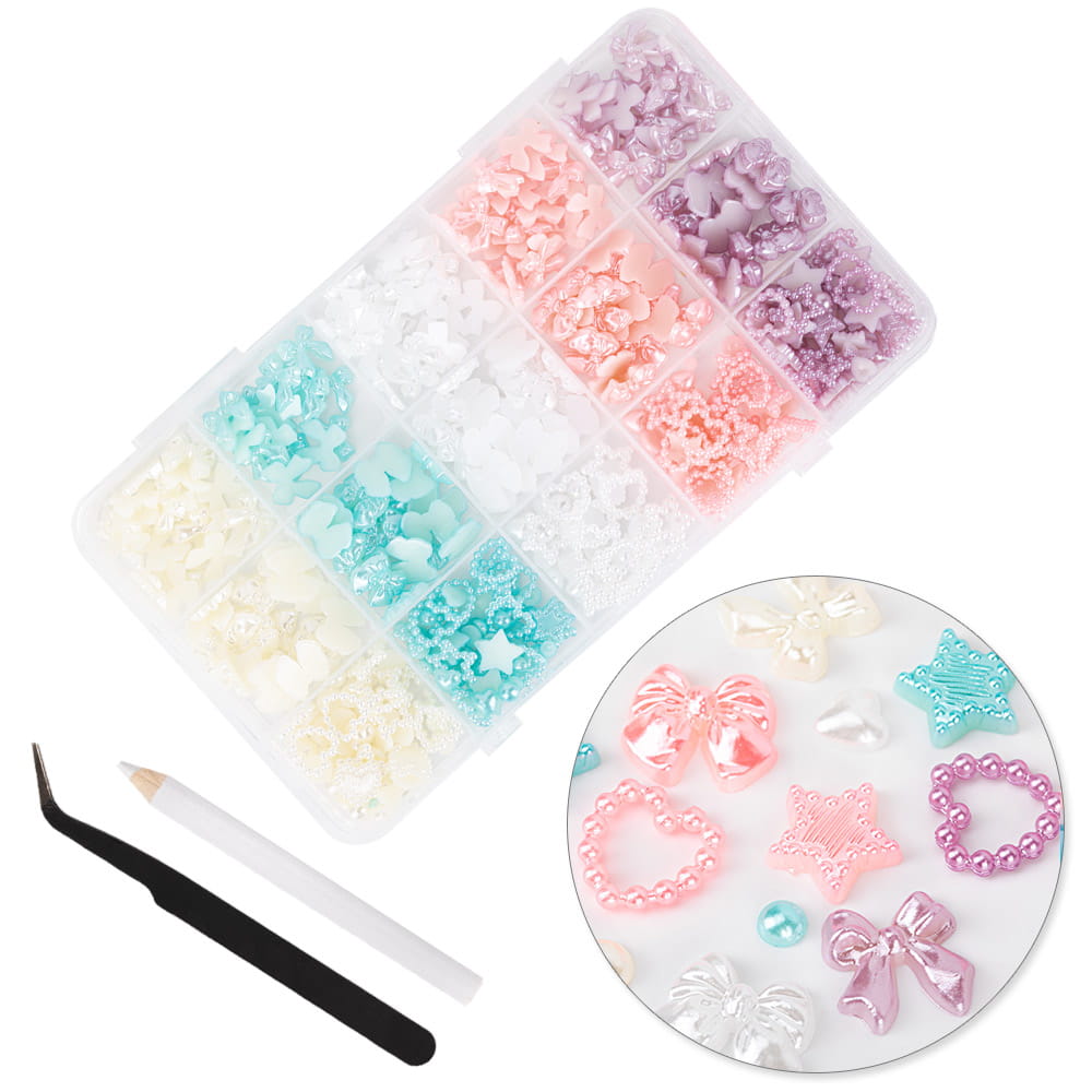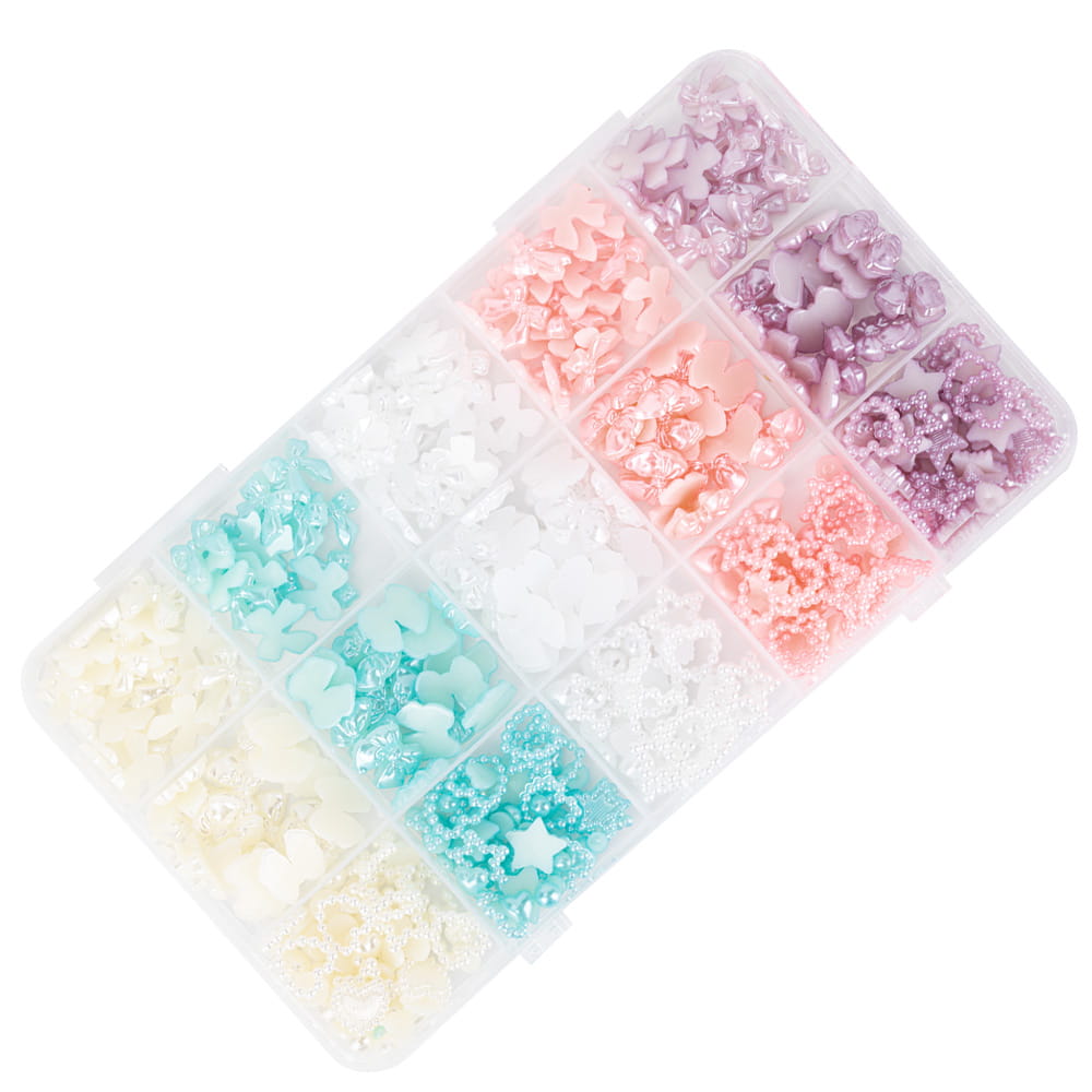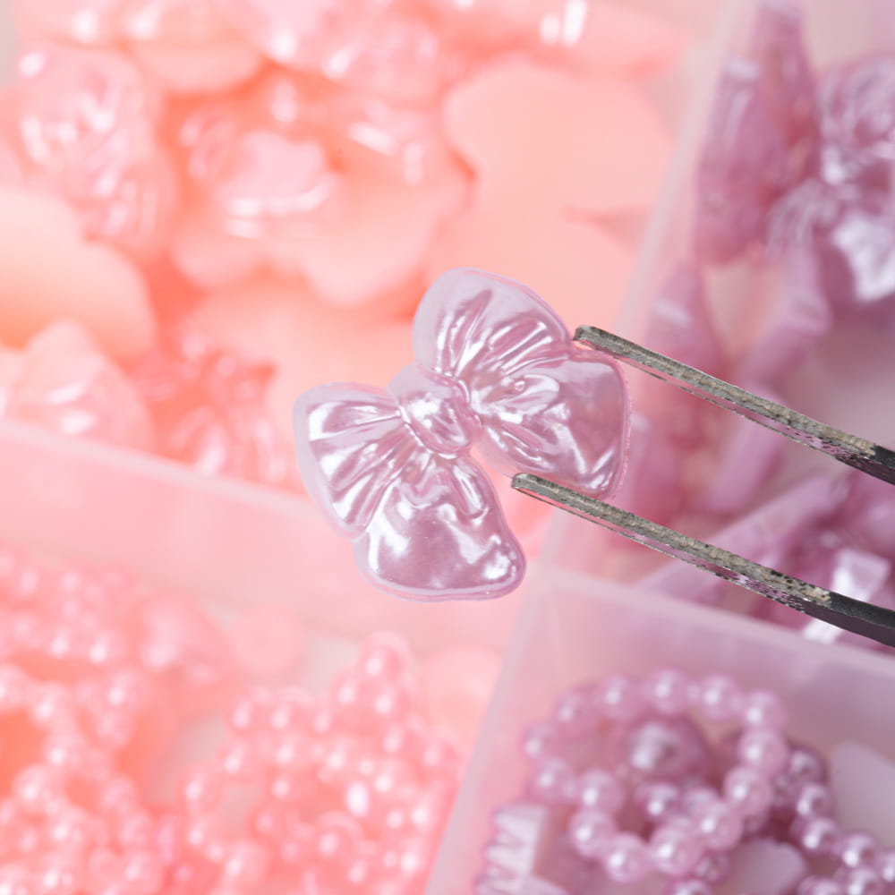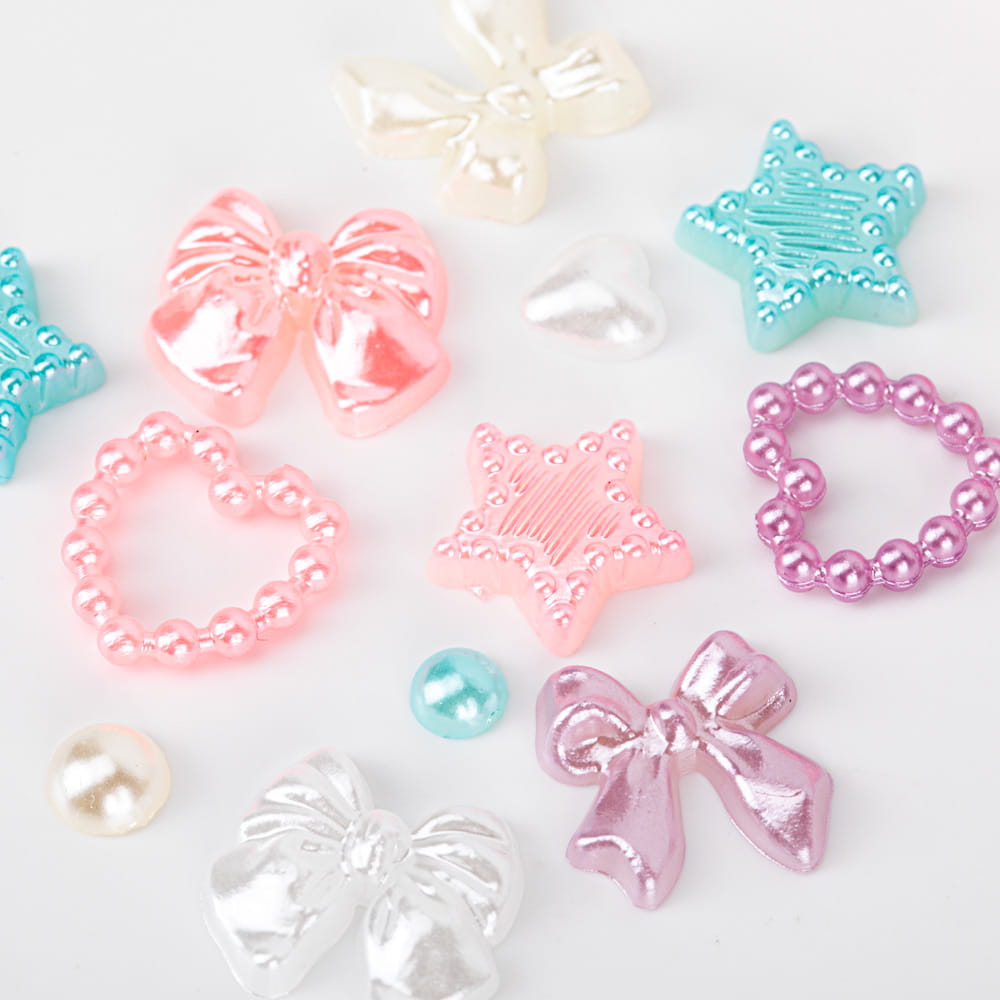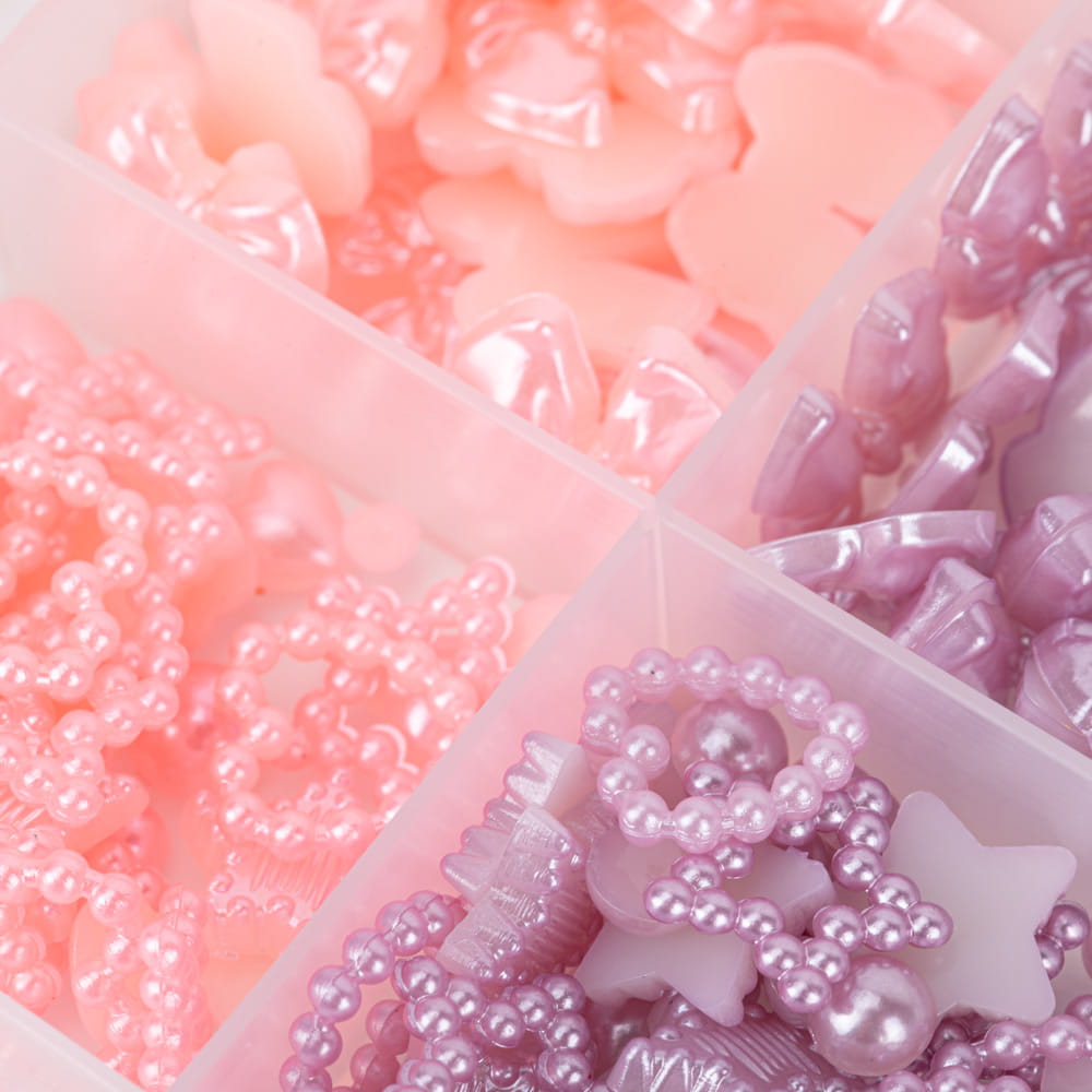 - Zestaw bogaty w różne kształty: perełki, cyrkonie, kokardki, serca, kwiaty, bulion i inne (w zależności od wariantu).