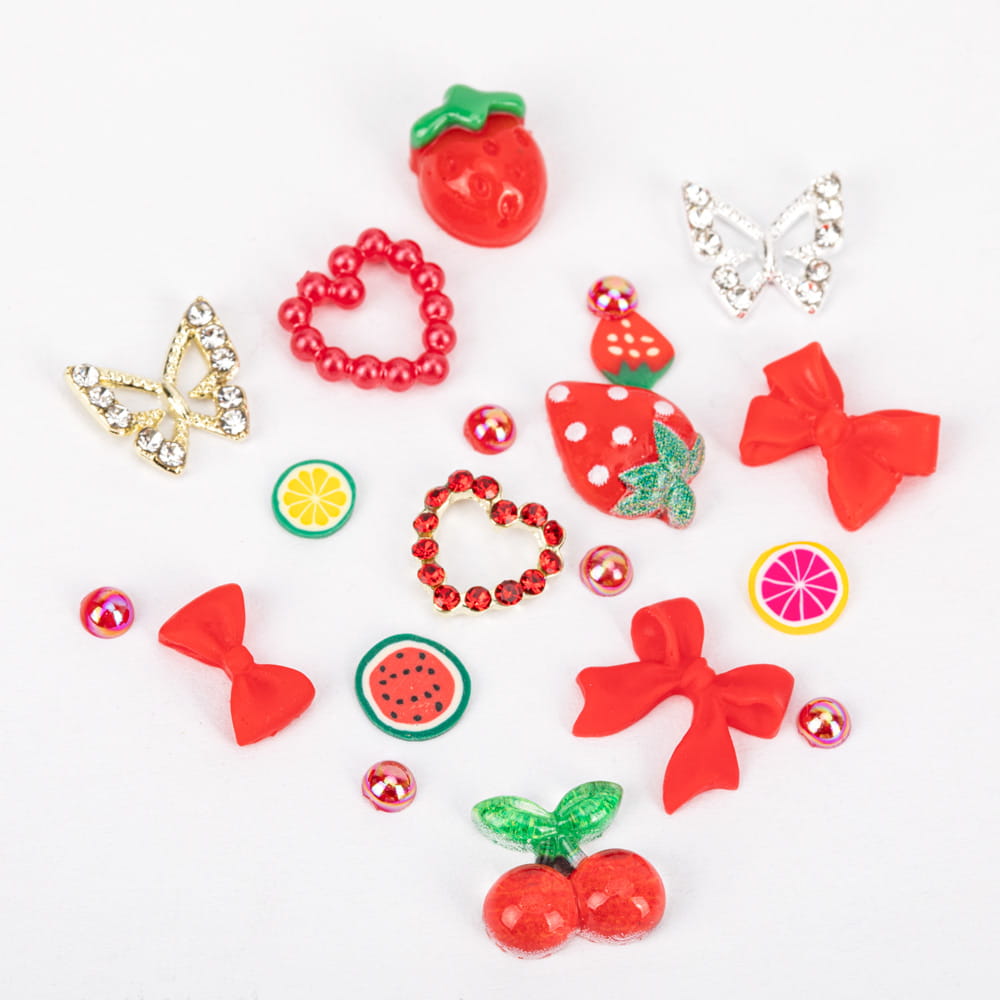 - Zestaw bogaty w różne kształty: owoce, cyrkonie, kokardki, serca, wisienki, motyle,bulion i inne (w zależności od wariantu).