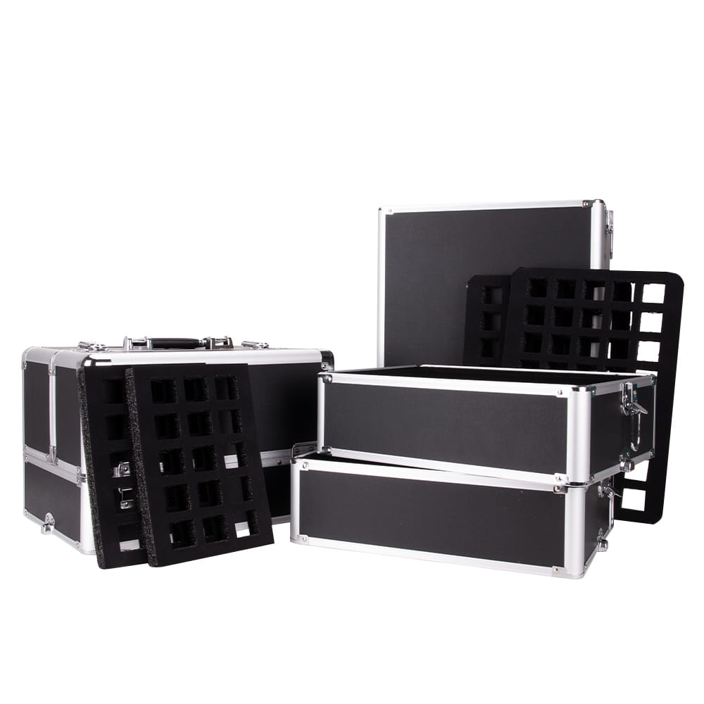 Funkcjonalny kuferek kosmetyczny idealny dla stylistek paznokci, kosmetyczek, wizażystek pracujących w terenie lub do przechowywania kosmetyków w domu. Wyposażony jest w 4 przedziały, z których aż dwa można zdemontować, by zmniejszyć jego wysokość i pojemność. Wnętrze wyłożone jest przyjemnym materiałem zbliżonym do aksamitu, a w poszczególnych przedziałach znajdują się demontowane przekładki do przechowywania lakierów (na stojąco) lub innych, niewielkich przedmiotów.