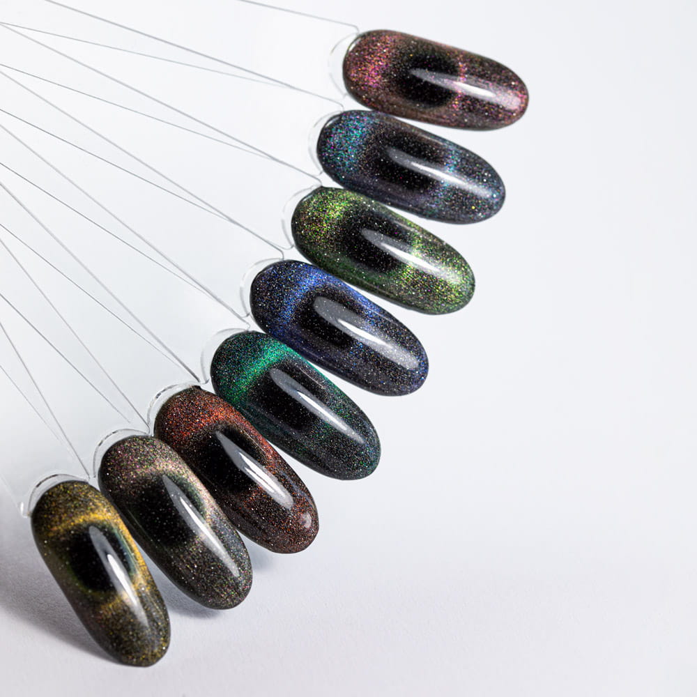 Cat Eye Flashing Magic to kolekcja magnetycznych lakierów hybrydowych z efektem flash. Zróżnicowana gama kolorystyczna sprawi, że każda fanka połyskujących i wyjątkowych paznokci znajdzie coś dla siebie. Dodatkowo efekt kociego oka pozwala uzyskać spektakularny, trójwymiarowy manicure, który mieni się w zależności od ułożenia dłoni.