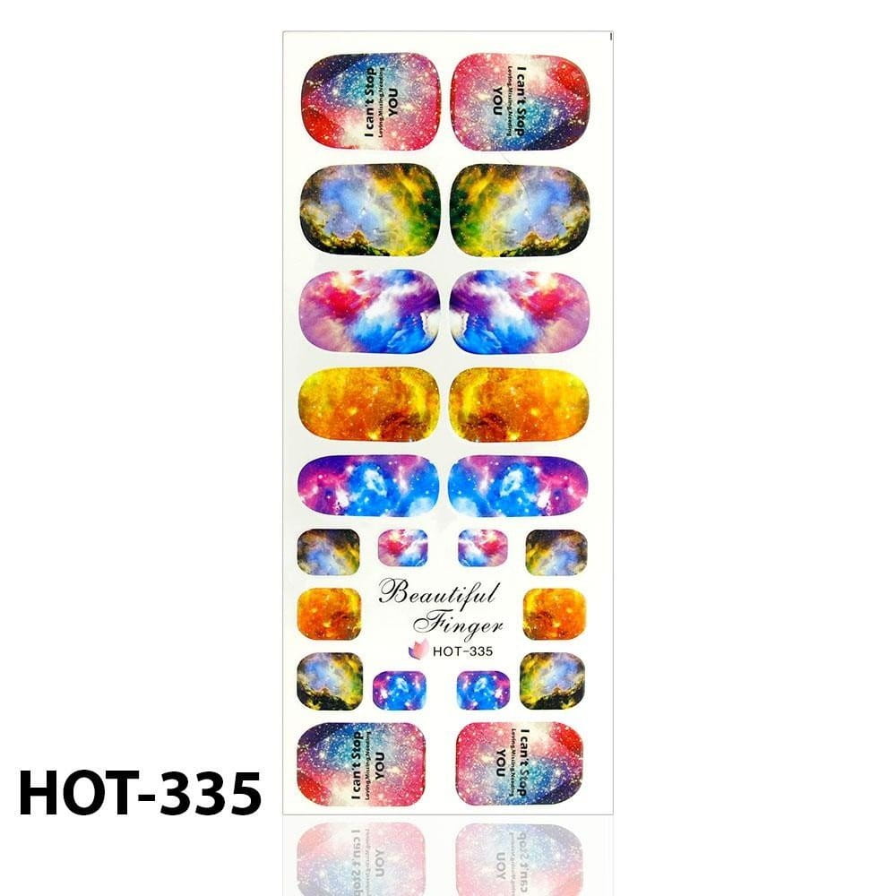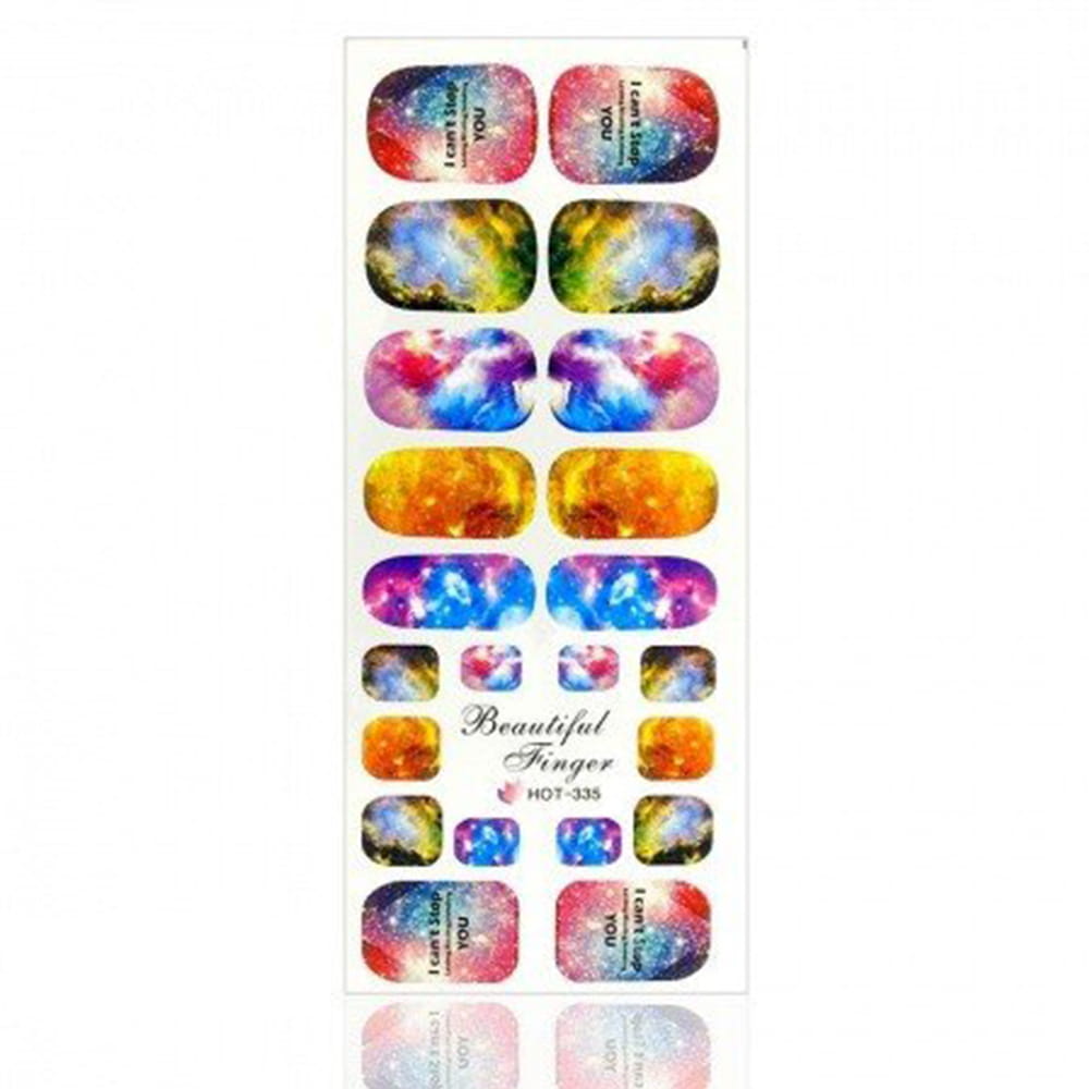 Na każdym arkuszu (12,5cm x 5,5cm) mieszczą się 22 naklejki - 1 na każdy paznokieć u rąk i stóp (+2 w zapasie).