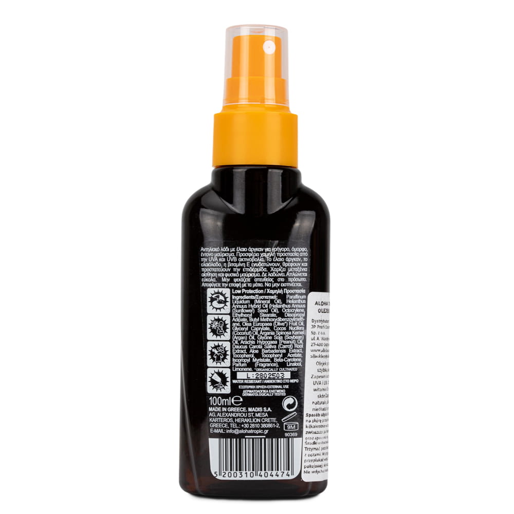 Aloha Tropic Dark Tanning Micro Argan Oil SPF 6 to arganowy olejek przeciwsłoneczny, który wspiera uzyskanie intensywnej, ciemniejszej opalenizny przy jednoczesnej ochronie przed promieniowaniem UVA i UVB. Zawartość oliwy z oliwek, oleju arganowego i witaminy E, sprawia, że skóra pozostaje nawilżona i odżywiona. Nietłusta, wodoodporna formuła zapewnia komfort użytkowania.