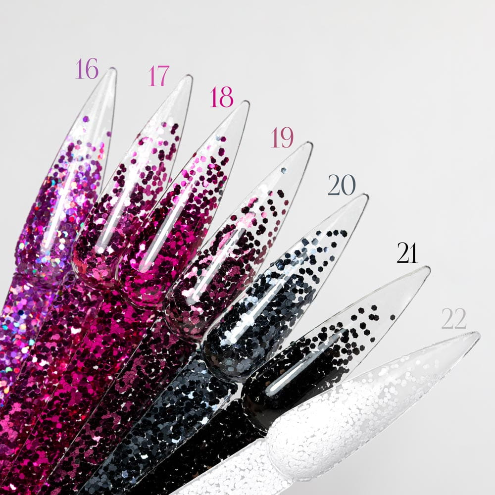 Drobiny można zatapiać pod warstwą żelu, akrylu lub bazie – tworząc efekt delikatnych „piegi” lub pełnej, błyszczącej tafli. Każdy numer (1–21) to inna kombinacja kolorów i odcieni, dzięki czemu z łatwością dopasujesz ozdobę do swojego stylu.
