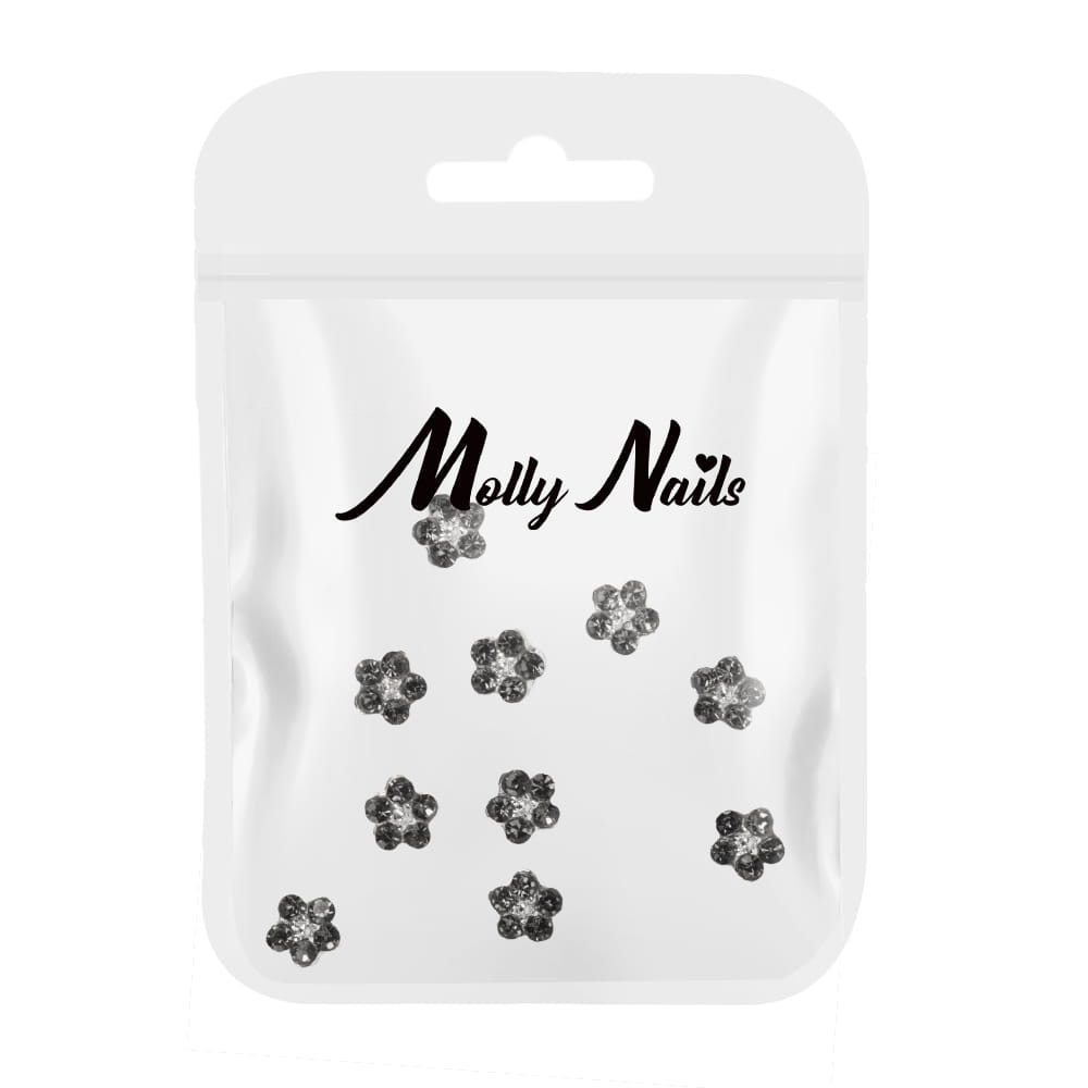 Wzbogać swoją stylizację o eleganckie ozdoby 3D w kształcie kwiatków od Molly Nails! Błyszczące cyrkonie osadzone w srebrnej podstawie nadają paznokciom luksusowego wyglądu i pięknie odbijają światło, tworząc efekt biżuteryjnego manicure.
