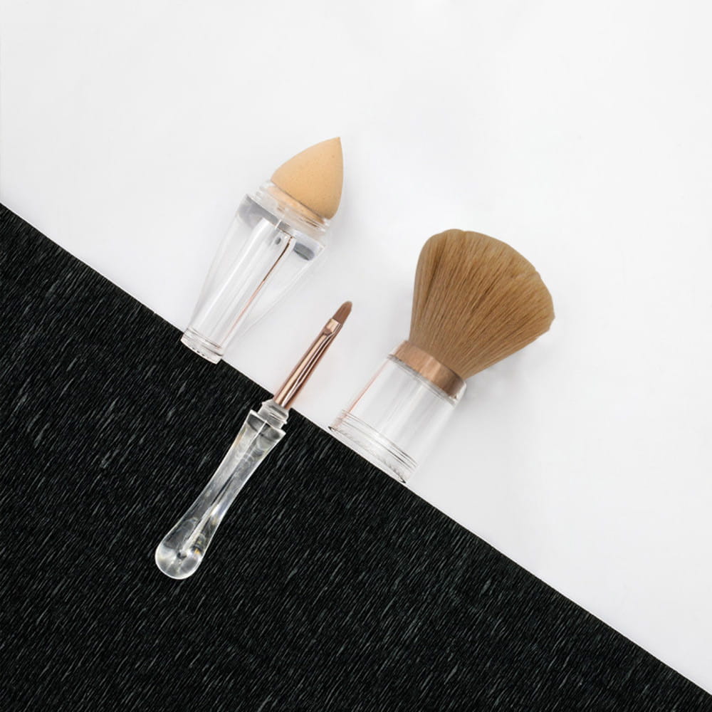 Składany pędzel do makijażu 3w1 posiada trzy różne głowice zamknięte w eleganckiej skuwce. Skuwka do pędzla stanowi transparentne etui, które ochroni pędzle przed zniszczeniem i zniekształceniami.