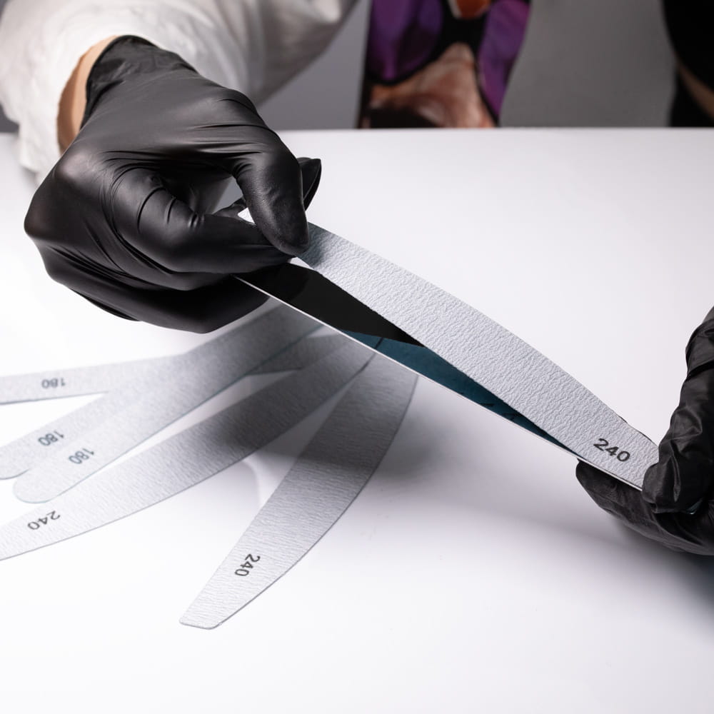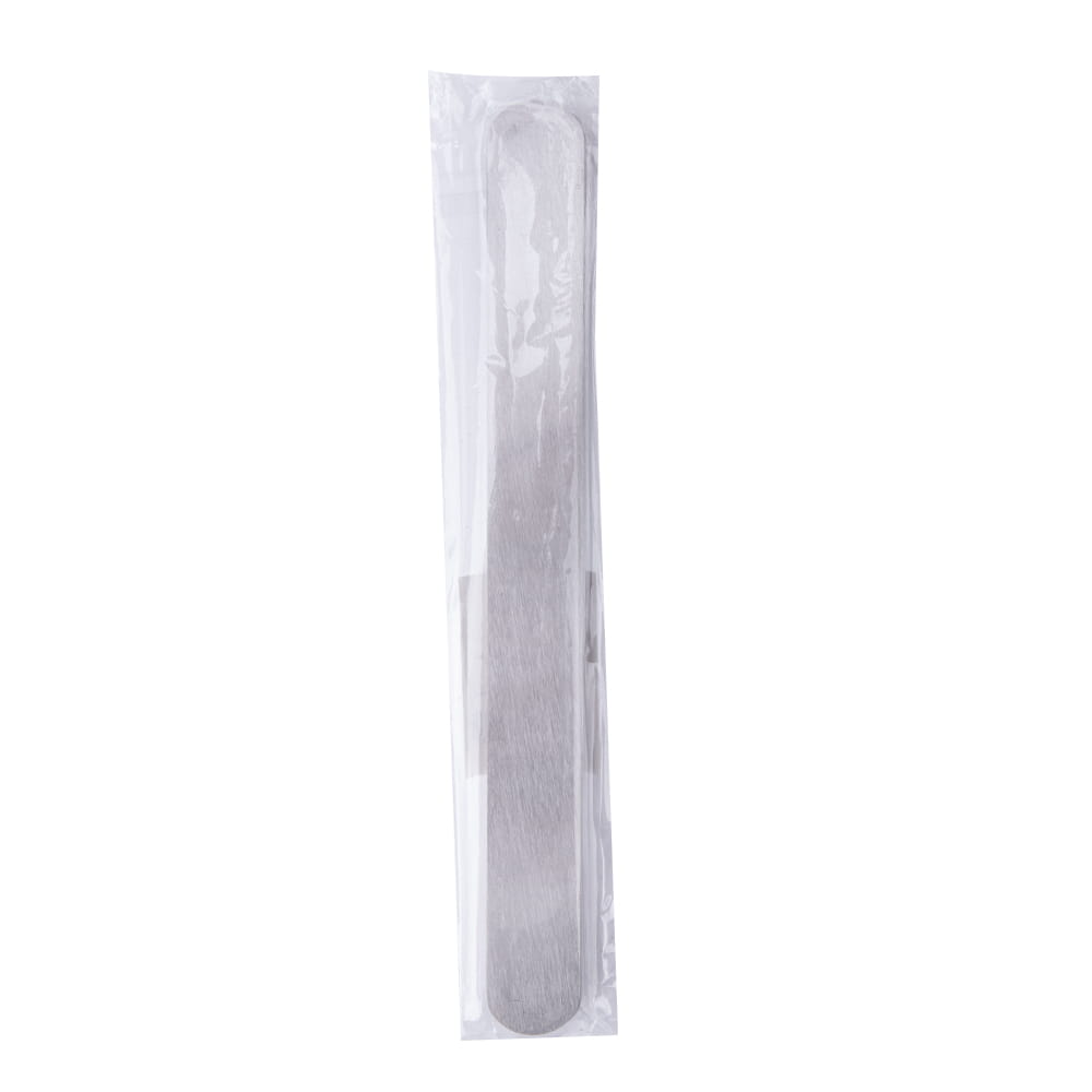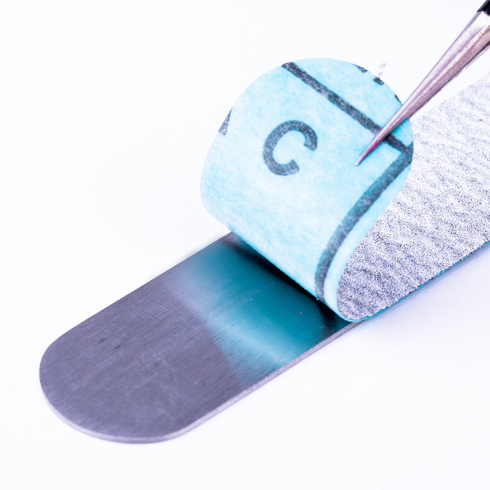 Profesjonalny pilnik/baza wykonany ze stali nierdzewnej. Cechuje się wysoką odpornością na zużycie - stal ta wykorzystywana jest ponadto do produkcji narzędzi chirurgicznych. Produkt wygodnie leży w dłoni. Dokupić do niego trzeba nakładki ścierne samoprzylepne o różnej, wybranej przez siebie gradacji. Nośnik posiada gładkie polerowane krawędzie dzięki czemu znacznie trudniej o niepotrzebne uszkodzenia/ zacięcia delikatnej skóry dłoni klientki co często zaobserwować można w przypadku tradycyjnych pilników. Dzięki temu, że jest metalowy nie wygina się i nie odkształca. Nadaje się do sterylizacji w autoklawie.