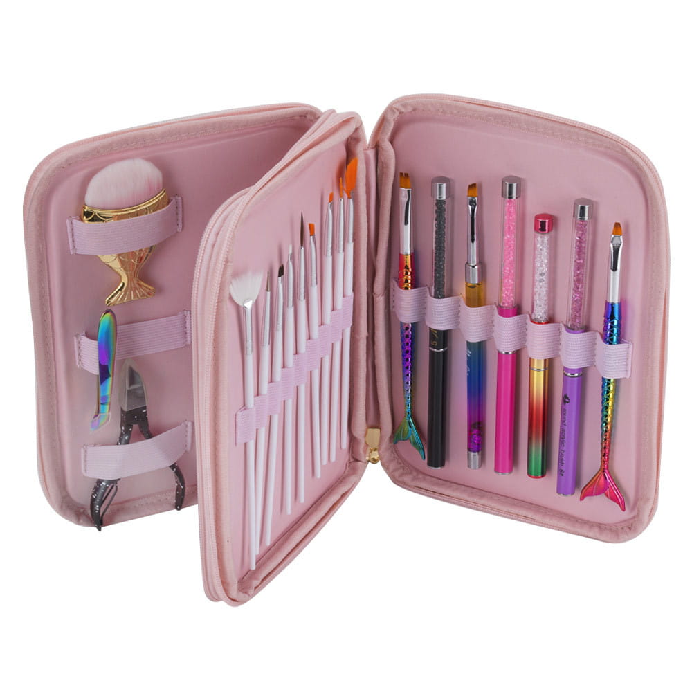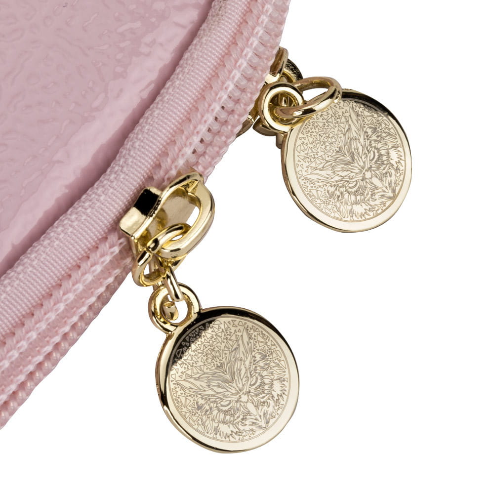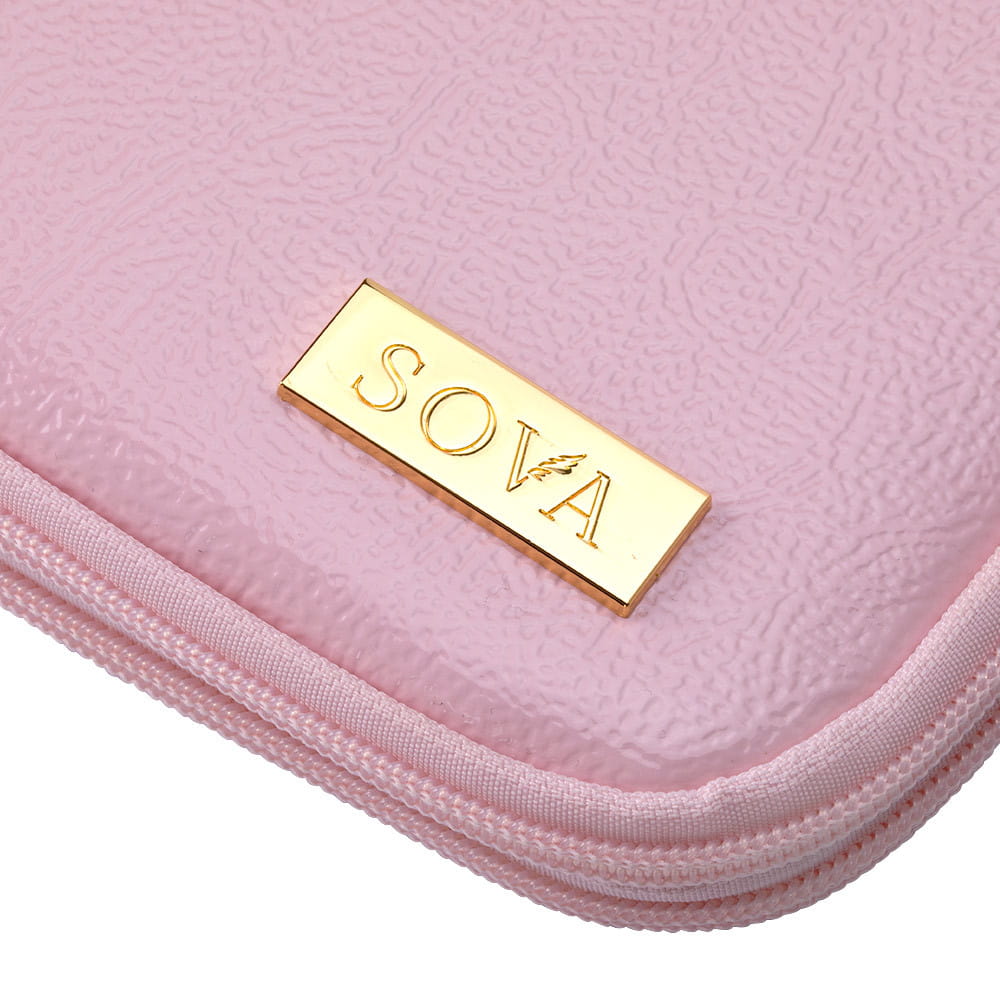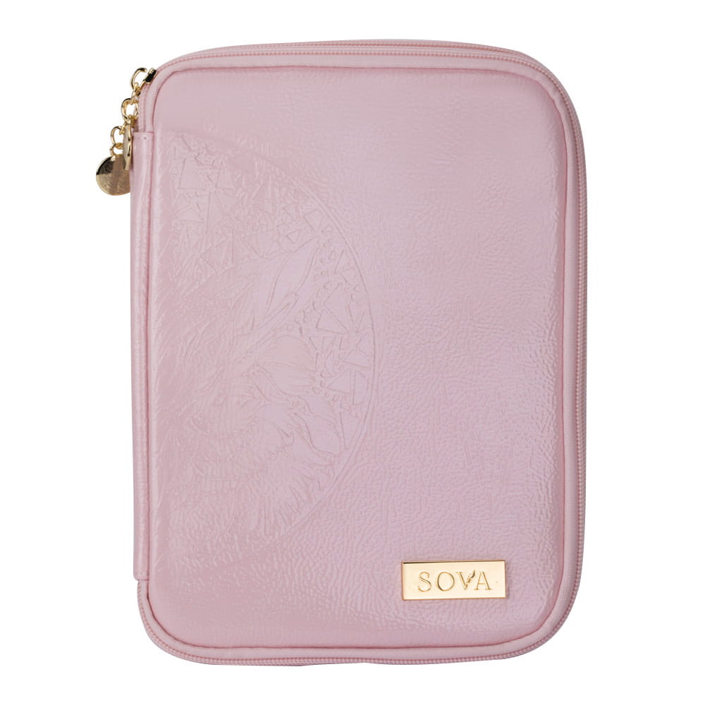 Autorski piórnik na pędzle i inne przybory stylistki w pięknym, różowym kolorze z wyjątkowym tłoczonym wzorem. Posiada dwie pojemne komory.