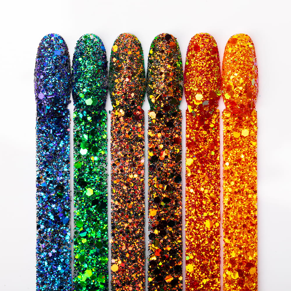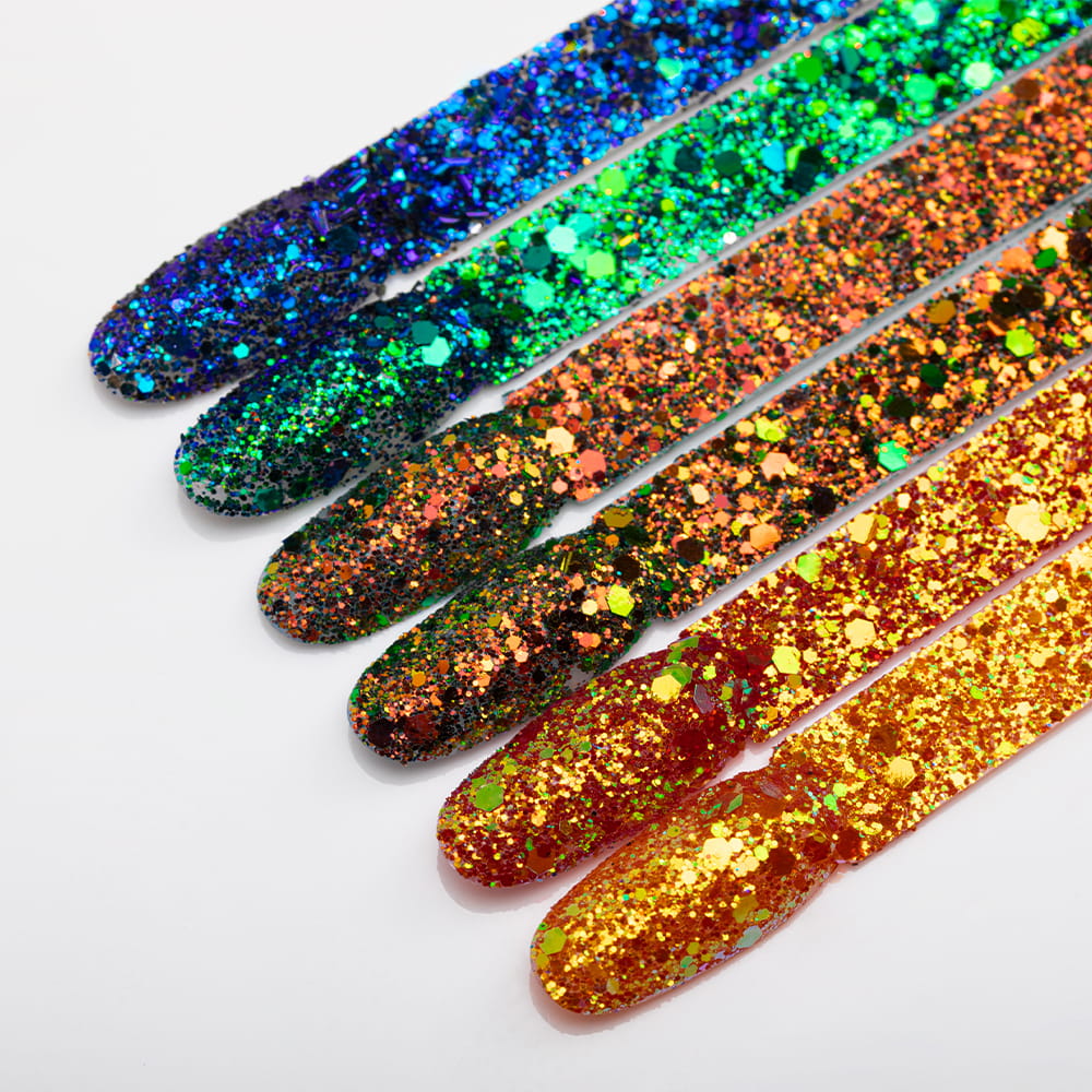 Płatki Glitter Bomb to spektakularny efekt, dzięki któremu zabłyśniesz niczym gwiazda filmowa! Metaliczne, pełne błysku płatki stanowią kompozycję trzech różnej wielkości drobinek, co sprawia, że ich struktura na paznokciu jest niejednorodna i zaskakująca – od delikatnych, niewielkich okręgów, po największe heksagony.