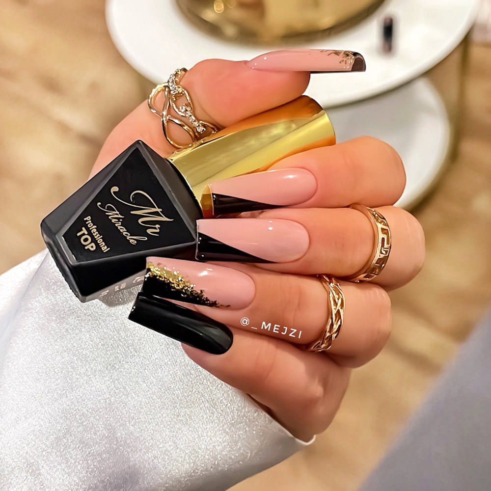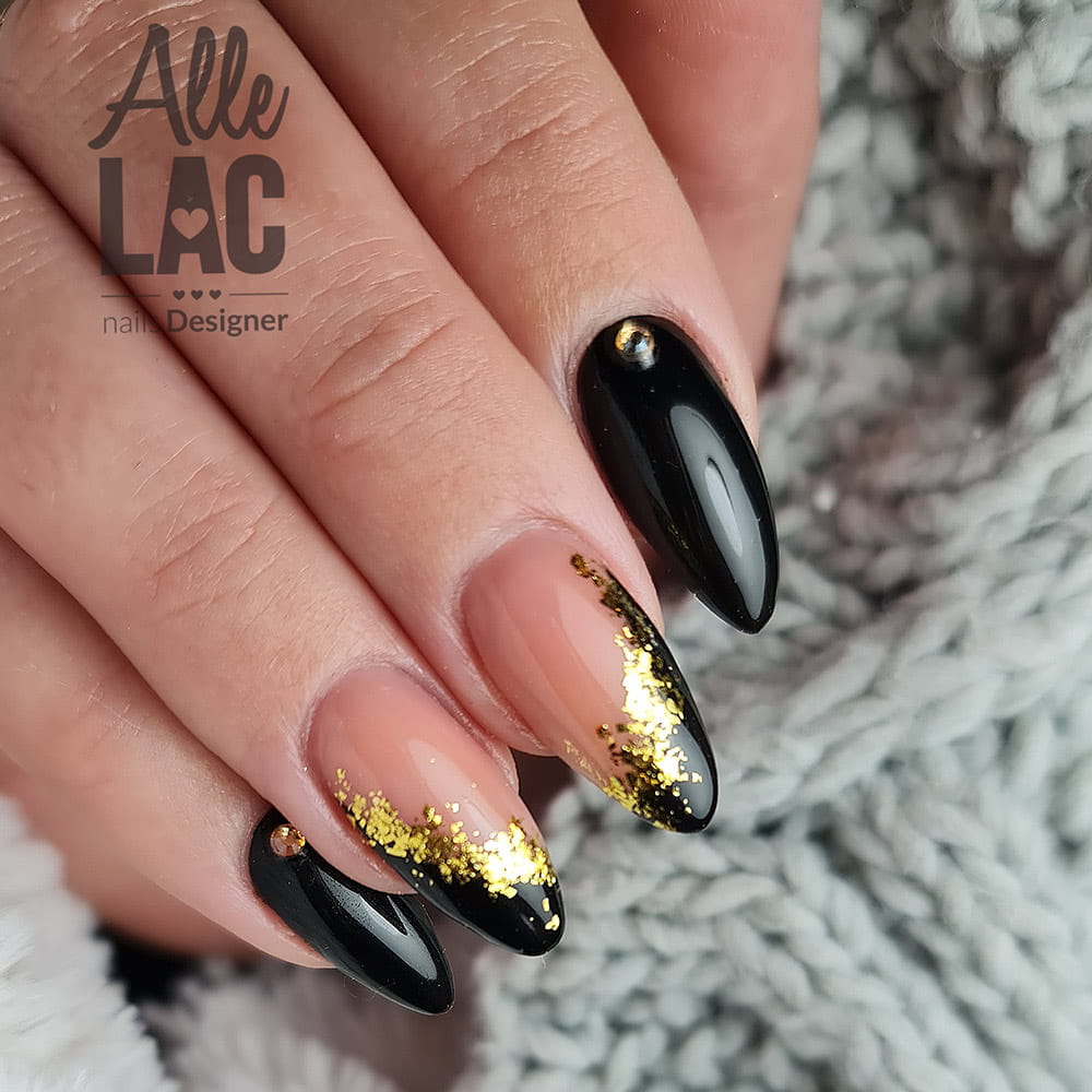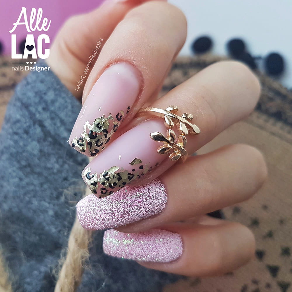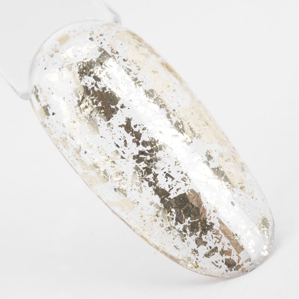 - Jeśli chcesz uzyskać tylko nieregularne kształty rozproszonych drobinek w metalicznej barwie-wystarczy zastosować np. Ulubiony lakier hybrydowy i w top bez dyspersji lub z dyspersją (każdy z nich zapewni inny efekt! Dyspersja-nieco mocniejszy efekt 3d, bez dyspersji-delikatniejszy niczym folia) nałóż odrobinę płateczków, a następnie pokryj całość raz jeszcze topem i utwardź. Gotowe.