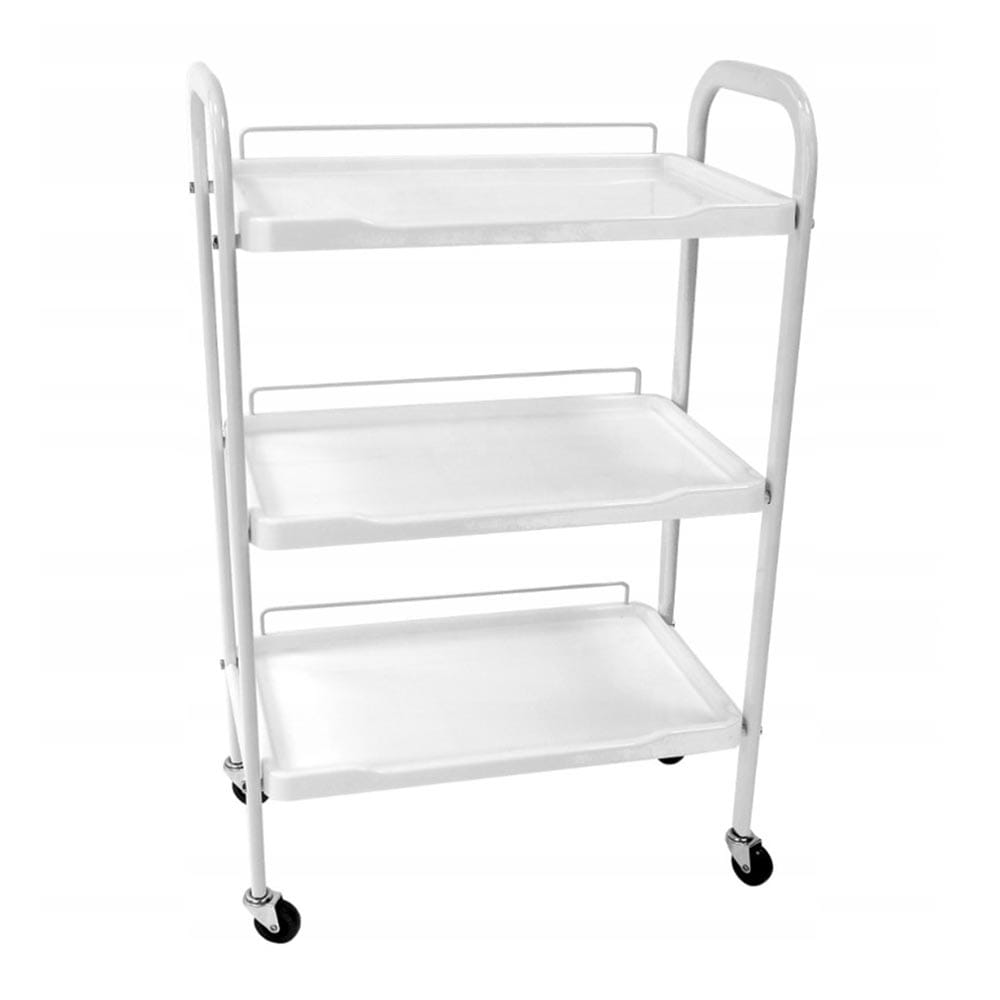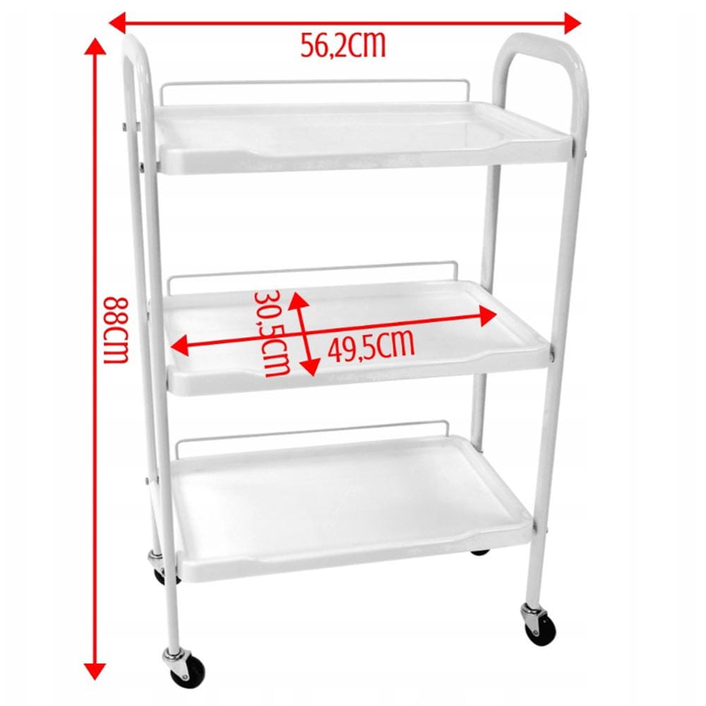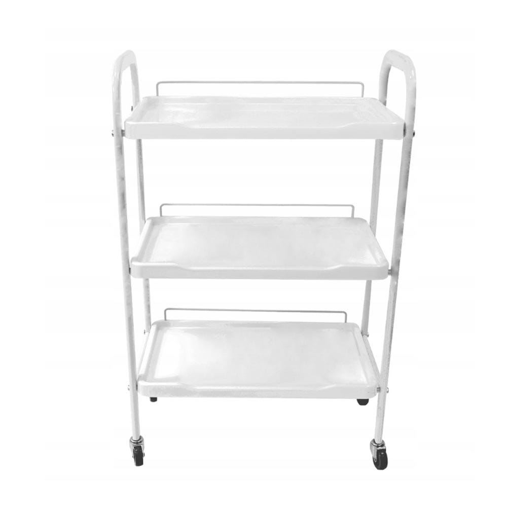 Stolik kosmetyczny z trzema półkami. Posiada stabilny stelaż z kółkami, które pozwalają na swobodne przemieszczanie stolika.