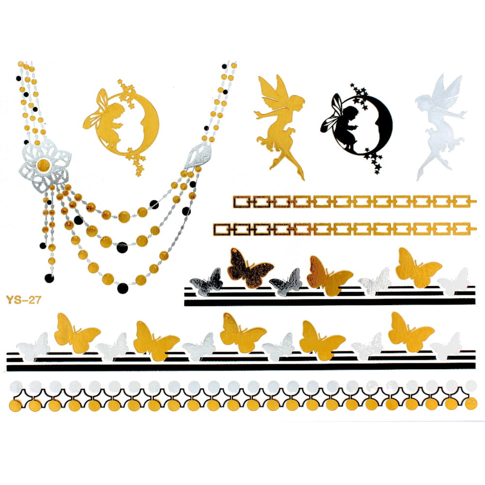 Najmodniejszy trend ostatnich lat, który najpierw zagościł na New York Fashion Week - biżuteria w formie metalicznego tatuażu tymczasowego. Tylko od Ciebie zależy gdzie i jak nakleisz swój tatuaż. Może to być bransoletka, naszyjnik, pierścionek czy inna ozdoba. Jedynym ograniczeniem jest Twoja fantazja. Tatuaże pięknie zdobią ciało i pozwalają wyróżnić się w tłumie. Jest to doskonała ozdoba ciała na lato, świetnie zastępująca klasyczną biżuterię, zwłaszcza przy skąpym odzieniu czy kostiumie kąpielowym. Aplikacja tatuażu jest dziecinnie prosta i działa jak klasyczna kalkomania. Utrzymuje się na ciele w nienaruszonym stanie od 3 do 6 dni (poza miejscami zagięć i narażonymi na ścieranie). Nasze tatuaże są wodoodporne i nietoksyczne - klej w nich użyty posiada certyfikat laboratorium badań dermatologicznych potwierdzający brak substancji drażniących.