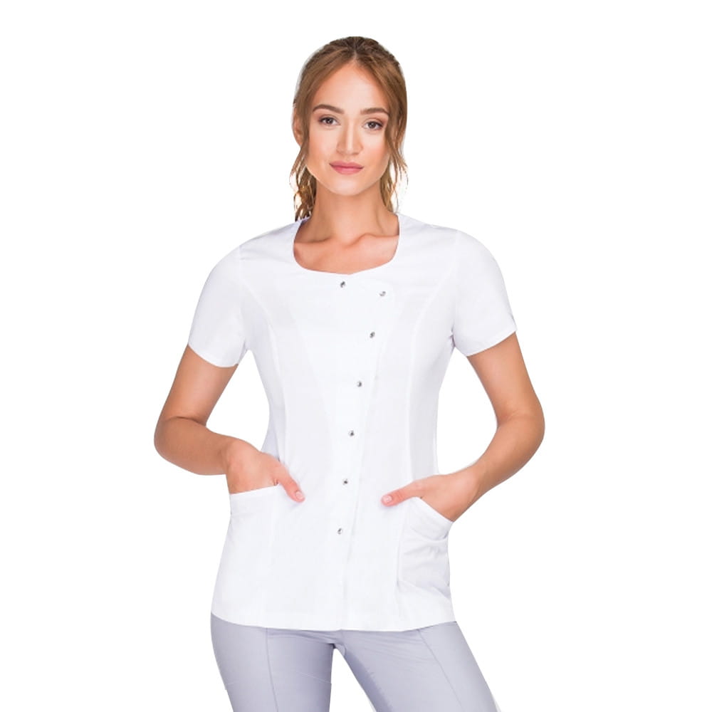 Niesamowicie kobiecy uniform kosmetyczny, posiadający wcięcie w talii, idealnie wysmukla sylwetkę każdej kobiety.