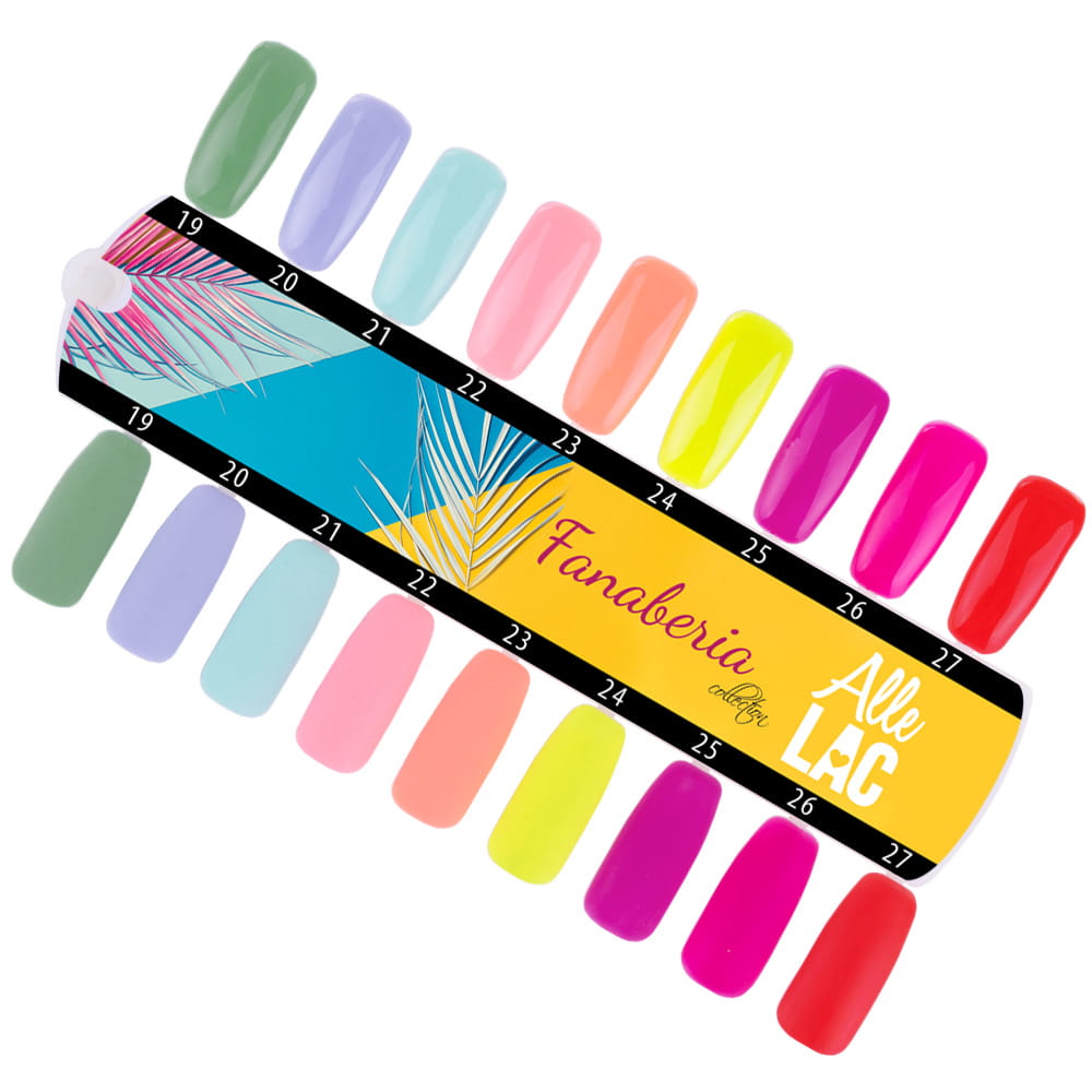 Przedstawienie 9 kolorów kolekcji AlleLac Fanaberia Collection w połysku i macie na ręcznie malowanym wzorniku.